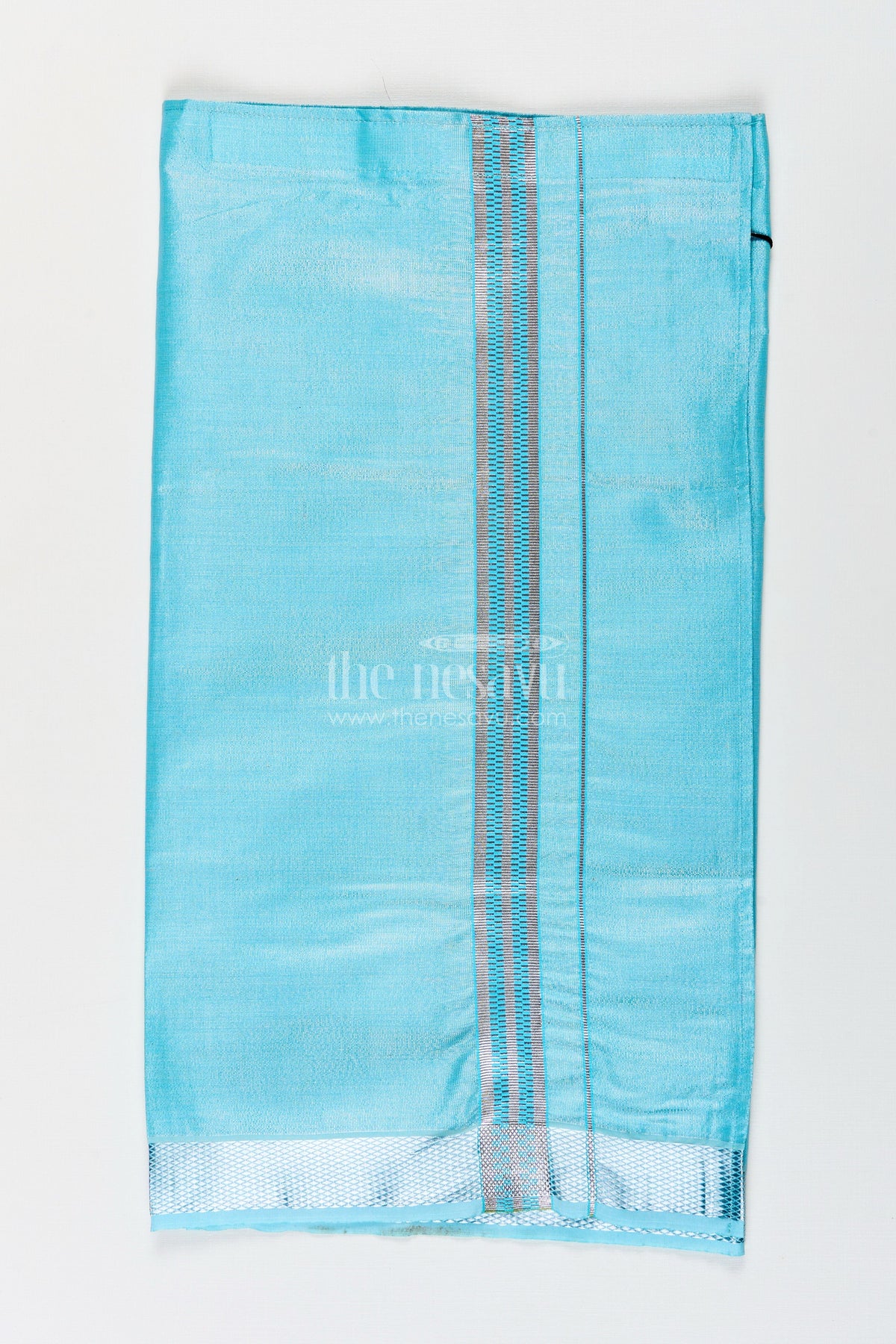 The Nesavu Boys Vesti Boys Turquoise Tissue Dhoti with Silver Zari Border for Vibrant and Comfortable Dhoti Clothing Nesavu Boys Dhoti Clothing Turquoise Tissue Silver Zari Border Vibrant Traditional Wear | The Nesavu
