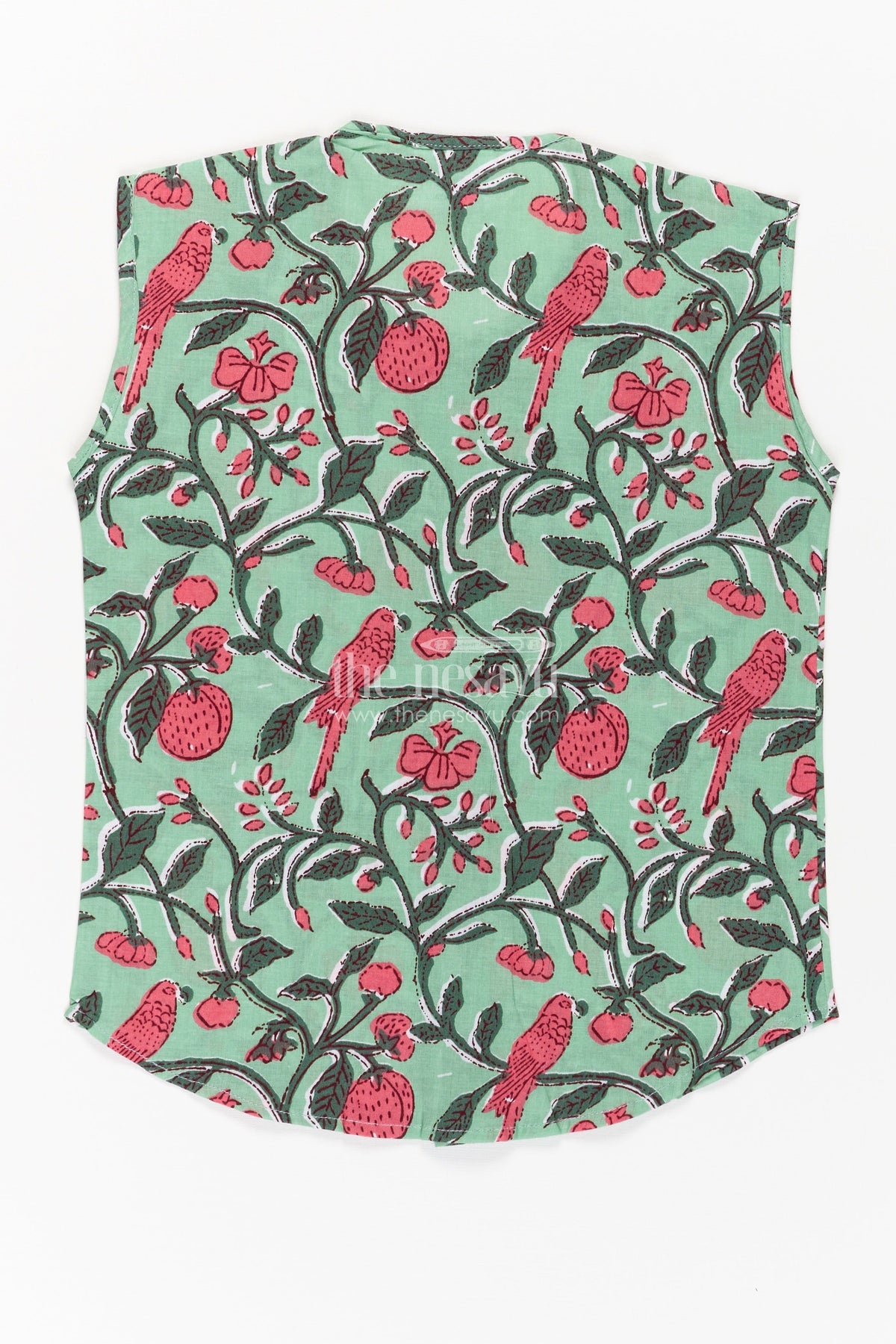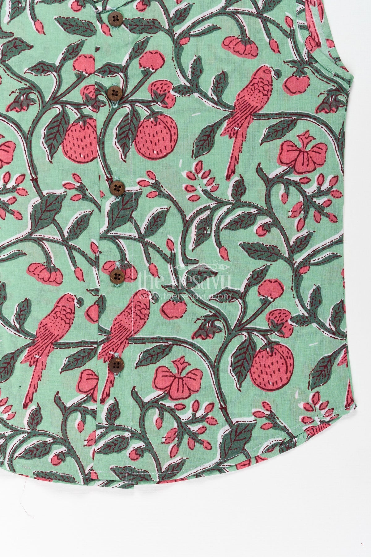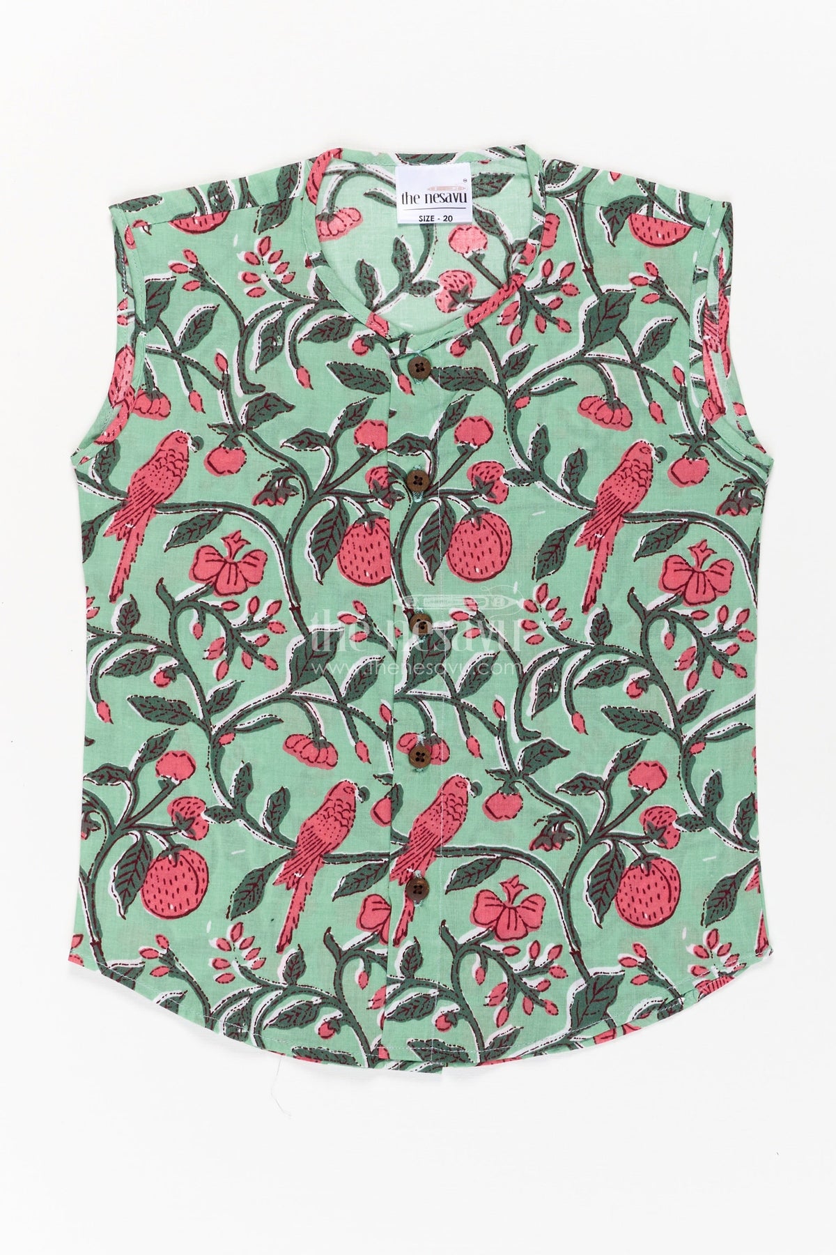 The Nesavu Baby Jablas Jabla Newborn Sleeveless Green Baby Shirt with Pink Bird and Floral Digital Prints Nesavu Jabla Newborn Green Cotton Sleeveless Shirt Pink Parrot Floral Digital Prints | The Nesavu