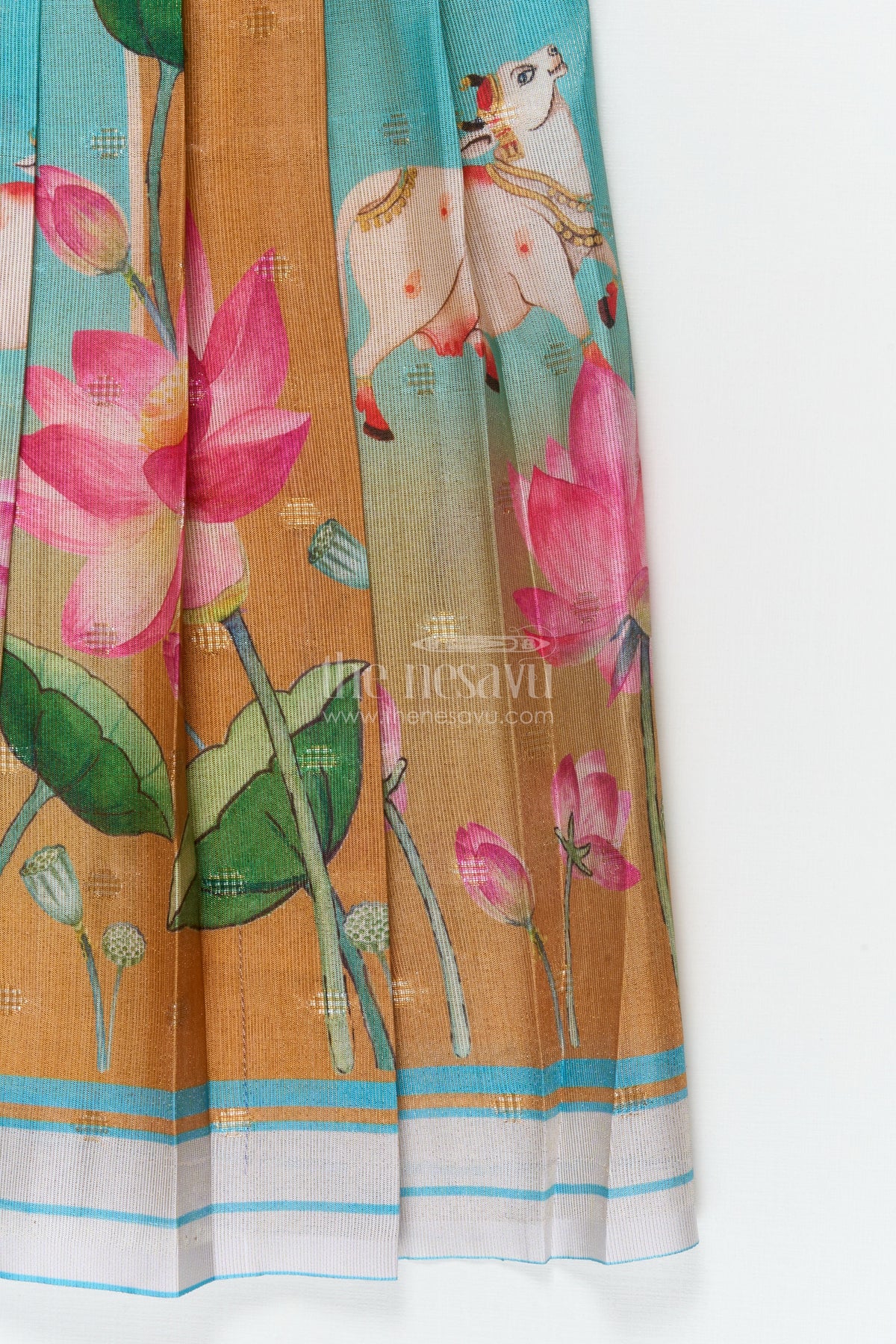 Features a unique lotus-printed skirt with golden backdrop and playful cows – a storytelling piece