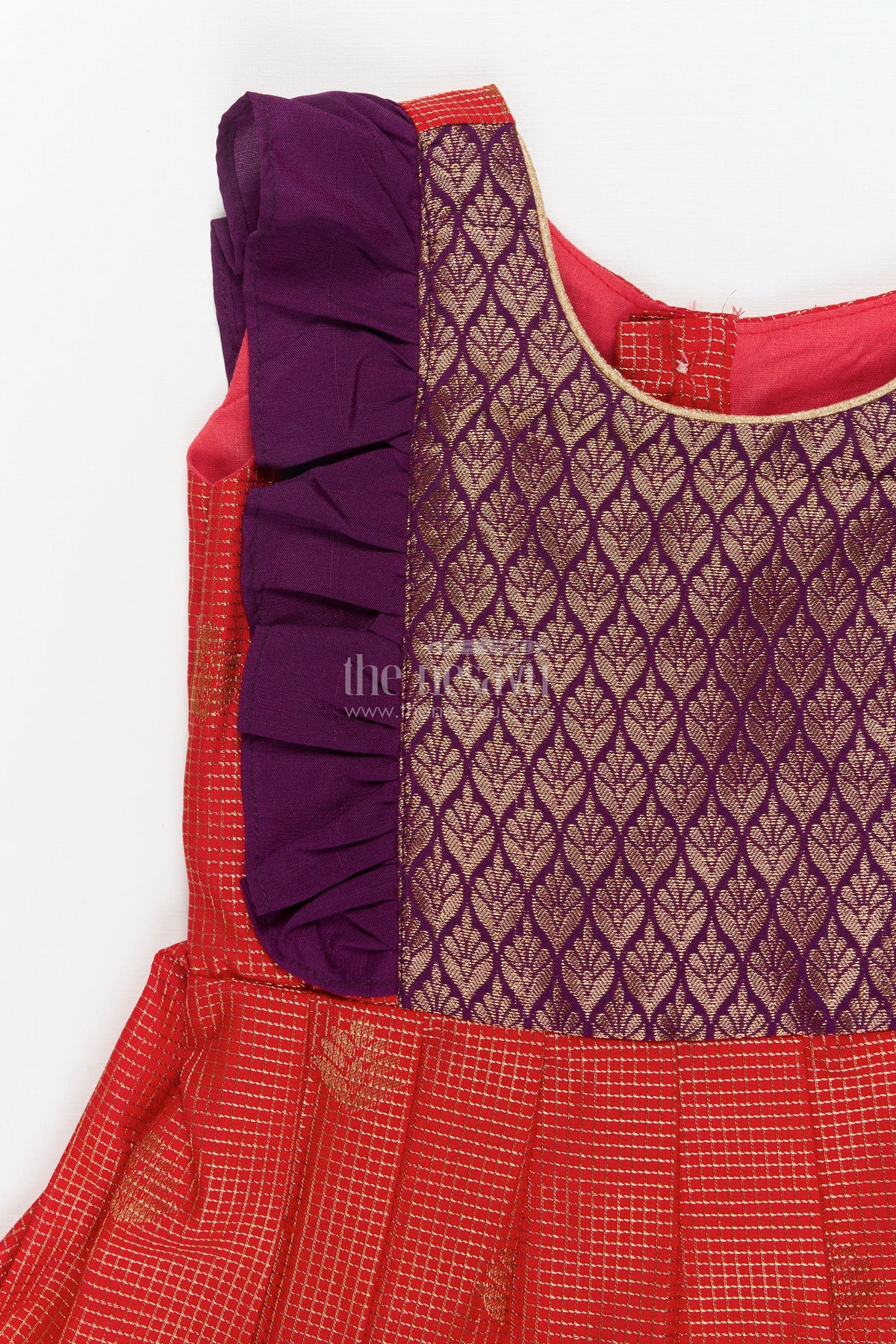 • Features an intricately woven zari yoke with traditional leaf motifs and contrast ruffle sleeves