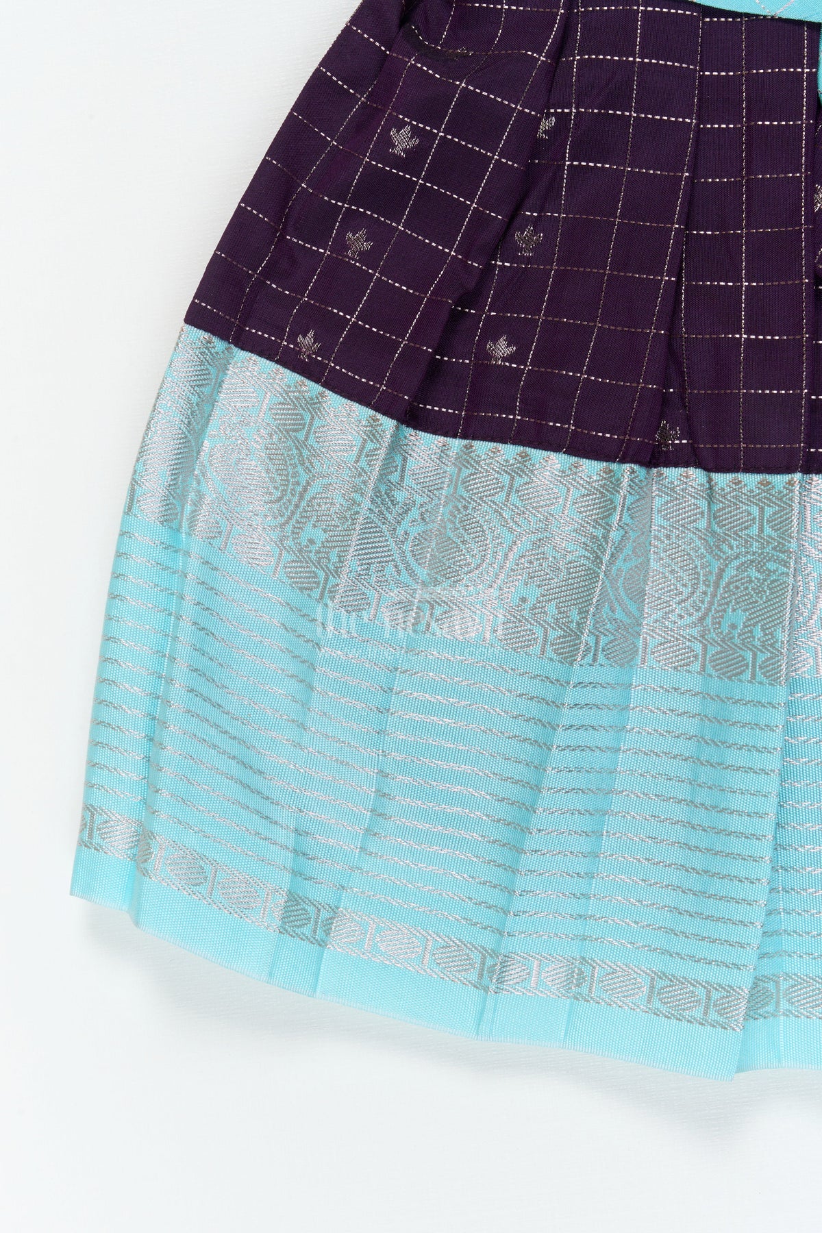 Features a zari-checked bodice and a pleated skirt with broad traditional borders
