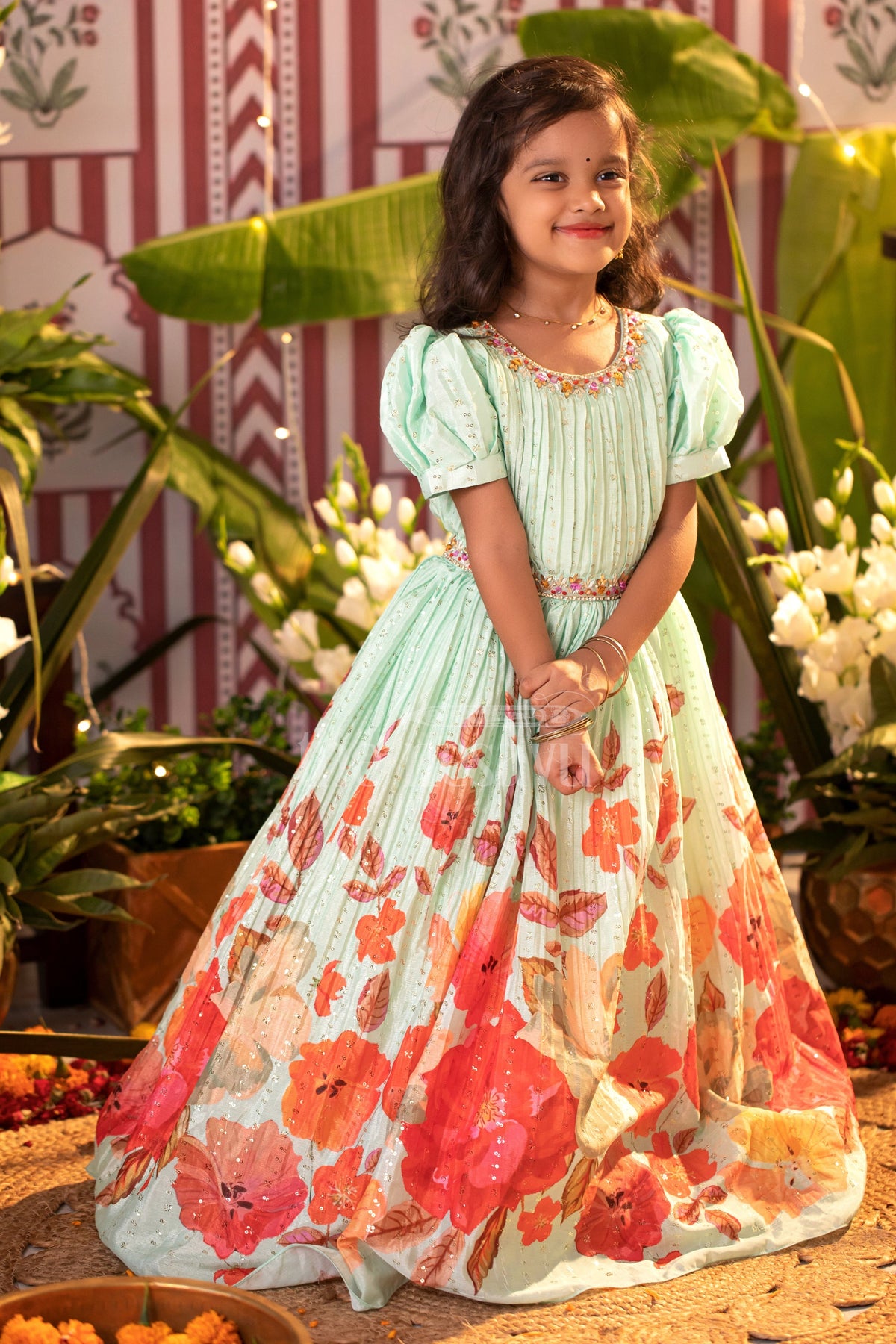 This Pista Green-colored party gown is a beautiful addition to any festive wardrobe. The gown features a pleated fabric with a designer floral print, offering a sophisticated look. It includes puff sleeves and embroidered neckline details, making it perfect for weddings and special events.