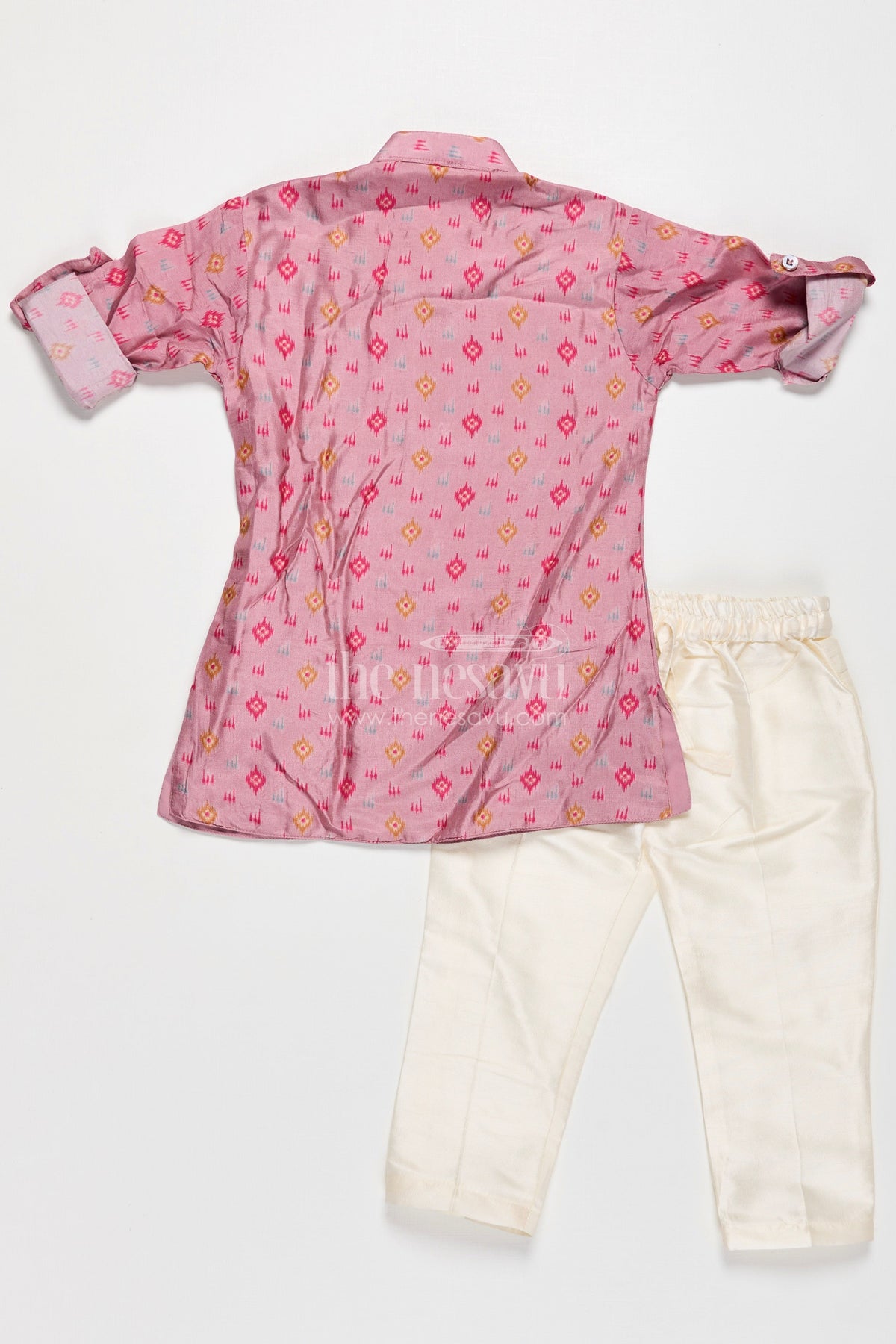 The Nesavu Boys Jacket Sets Boys Viscose Blend Jacket and Pants Set in Pink with Printed Kurta and Multicolor Ethnic Vest Nesavu 14 (6M) / Purple BES708A-14 Boys Viscose Blend Jacket Pants Set Pink Ikat Print Kurta Multicolor Nehru Jacket | The Nesavu
