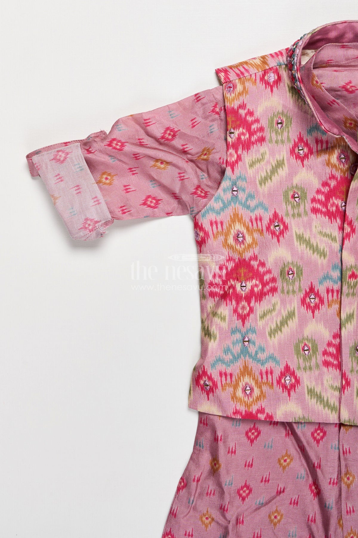 The Nesavu Boys Jacket Sets Boys Viscose Blend Jacket and Pants Set in Pink with Printed Kurta and Multicolor Ethnic Vest Nesavu Boys Viscose Blend Jacket Pants Set Pink Ikat Print Kurta Multicolor Nehru Jacket | The Nesavu