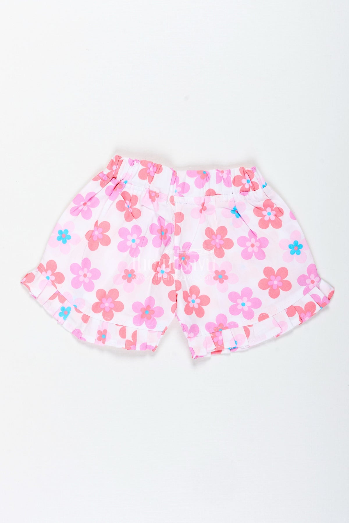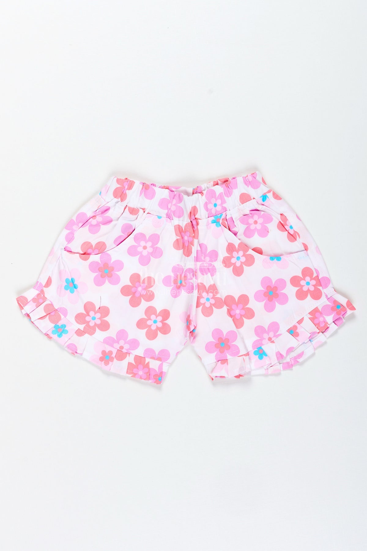 Girls Pink Floral Cotton Shorts with Pleated Hem for Playful Summer Wear