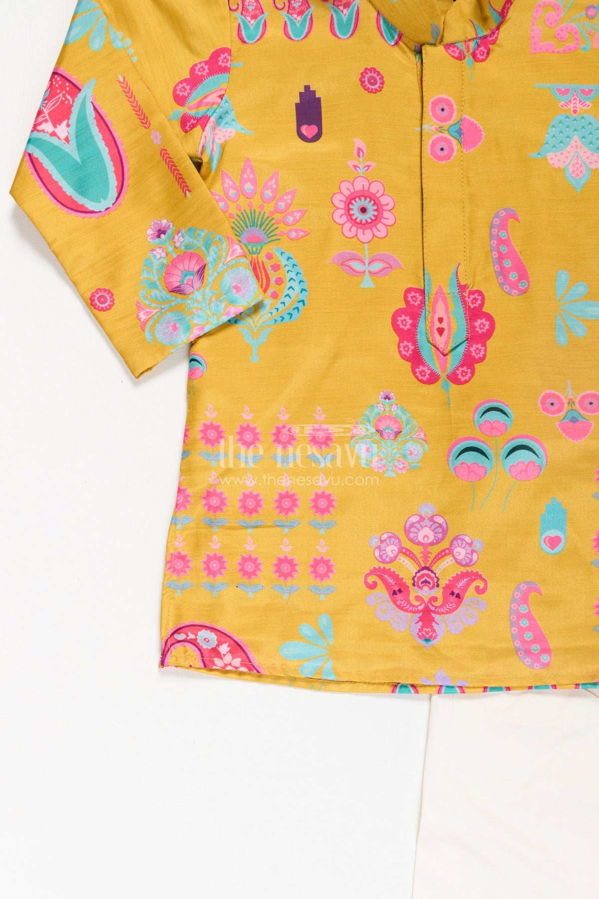 The Nesavu Boys Kurtha Set Ethnic Boys Kurta Set in Muslin Silk with Vibrant Traditional Prints Nesavu Ethnic Kurta Set Boys Muslin Silk Mustard Yellow Traditional Outfit | The Nesavu