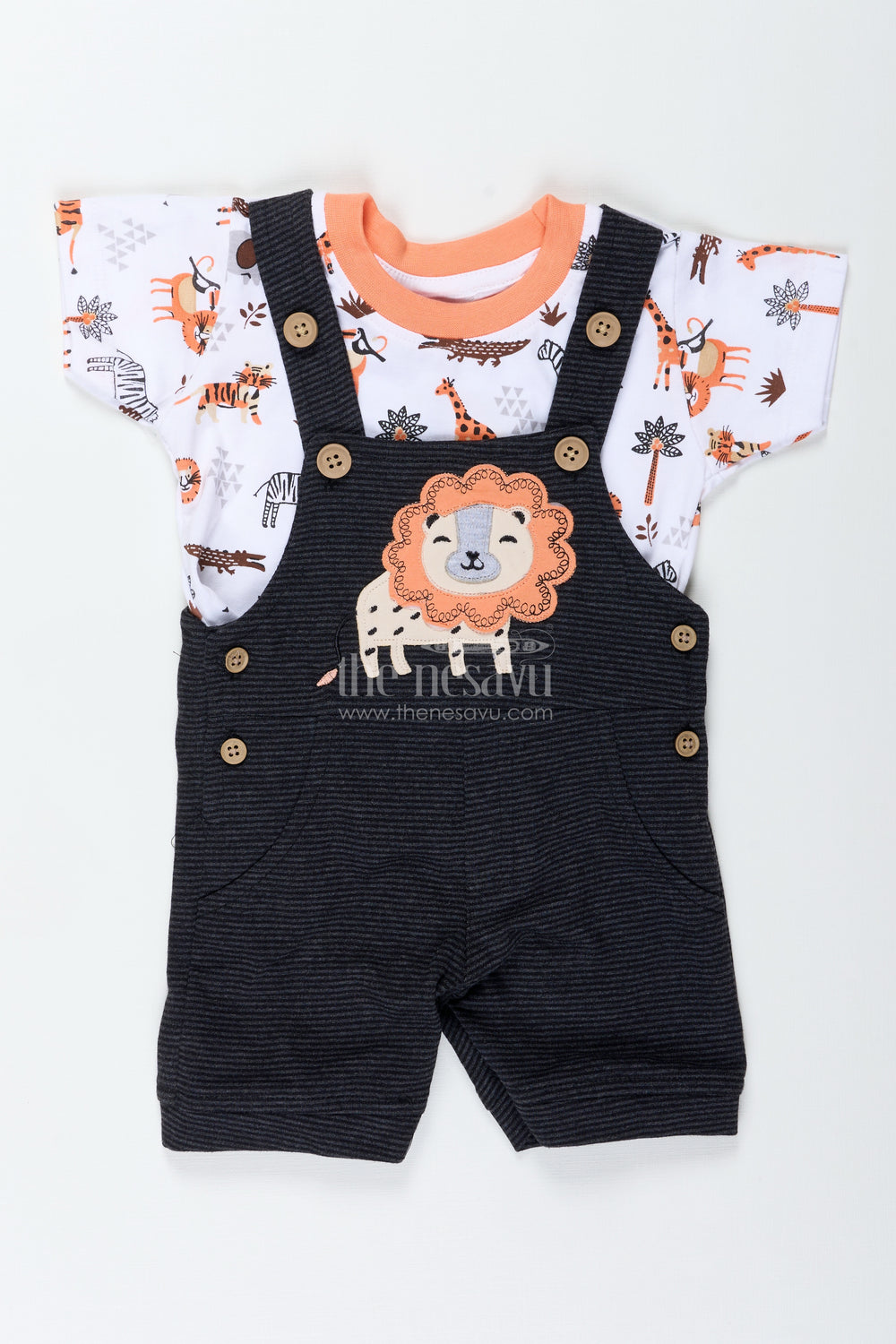 The orange casual dress is a bold and playful boys outfit made from cotton corduroy with animal digital print, combining soft texture with a touch of wild charm. Featuring dark orange overalls with a vibrant lion appliqué, this set is paired with a printed white T-shirt that complements the look perfectly. The sturdy yet breathable corduroy fabric ensures all-day comfort and durability, making it suitable for both active play and casual outings. The digital print and cheerful animal face bring lively appeal, while the structured shorts offer a clean fit. This outfit is perfect for little explorers with a flair for fun.