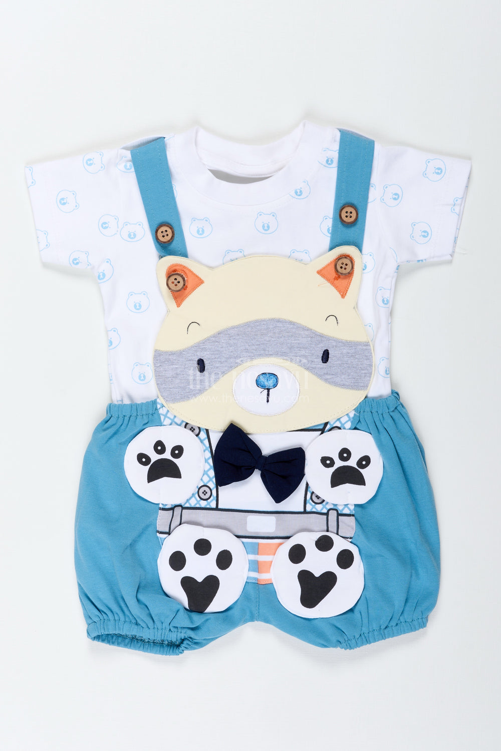 The digital print set is a vibrant boys cotton outfit that mixes playful design with exceptional comfort. Featuring a cute bear face on the front and cheerful paw patches on the shorts, this blue-themed set is made from cotton with animal digital print to keep your little one cool and comfy. The overalls include adjustable shoulder straps for an easy fit and are paired with a printed white tee for added charm. Perfect for casual playdates and day-to-day adventures, this digital print set is designed for little explorers who need freedom to move while staying stylish. The eye-catching blue overalls bring a fresh pop of color, making this set a standout piece in any wardrobe.