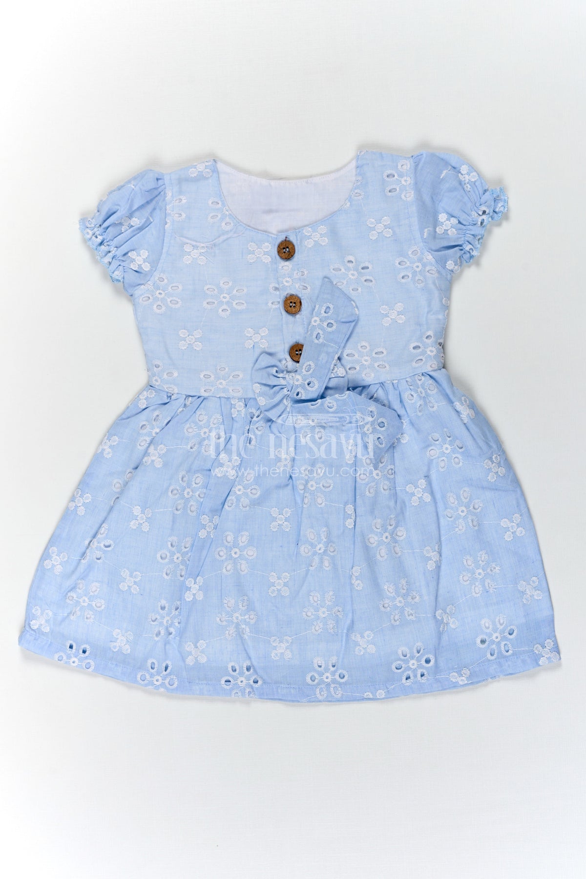 Casual wear party meets cool comfort in this lovely sky blue frock, tailored from breathable hakoba cotton. The all-over embroidered floral motifs give it a handcrafted feel, while the puff sleeves and fitted bodice provide a comfortable yet festive fit. Finished with rustic wooden buttons and a charming waist bow, this dress blends everyday simplicity with a dressy twist. Ideal for casual gatherings or low-key celebrations, it lets girls stay stylish without compromising on comfort.