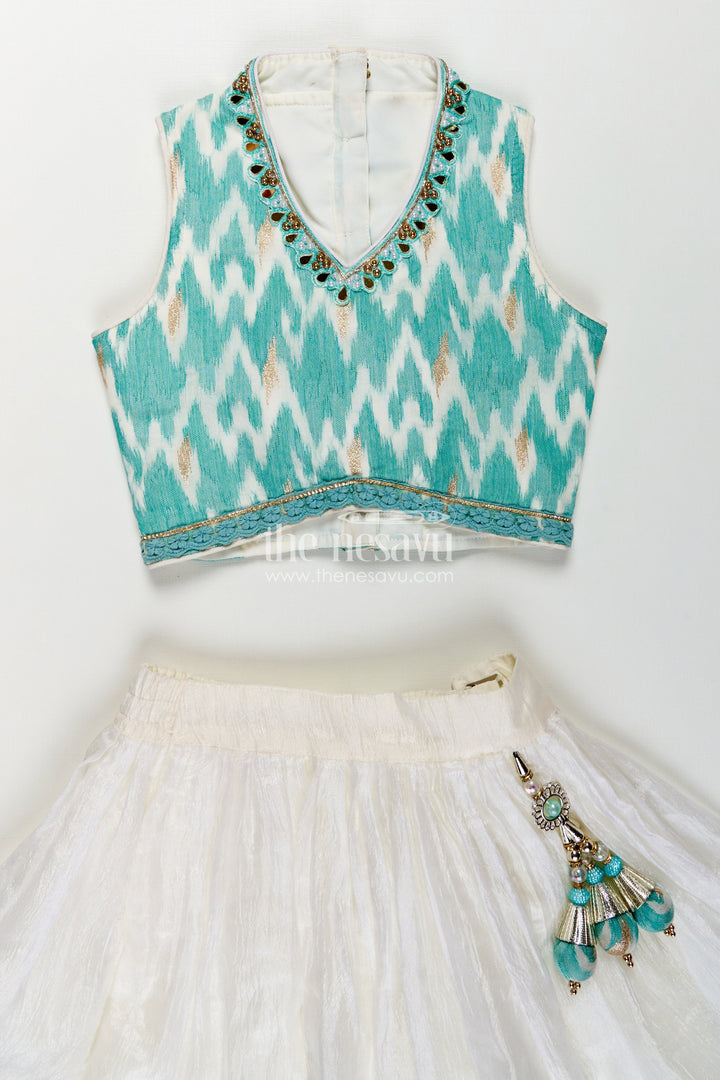 Latest collection lehenga choli for girls blends traditional elegance with modern charm in this beautifully crafted Chinon silk ensemble. The sleeveless aqua blue choli features an ikat-inspired pattern with mirror embroidery at the neckline, adding a touch of sparkle and grace. Paired with a flared white lehenga that flows effortlessly and a soft net dupatta trimmed with gold, this set is designed to dazzle at any celebration. The scalloped lace hem and coordinating tassel details complete the festive look. Crafted for both comfort and visual appeal, it’s the perfect outfit for weddings, temple visits, or family functions.