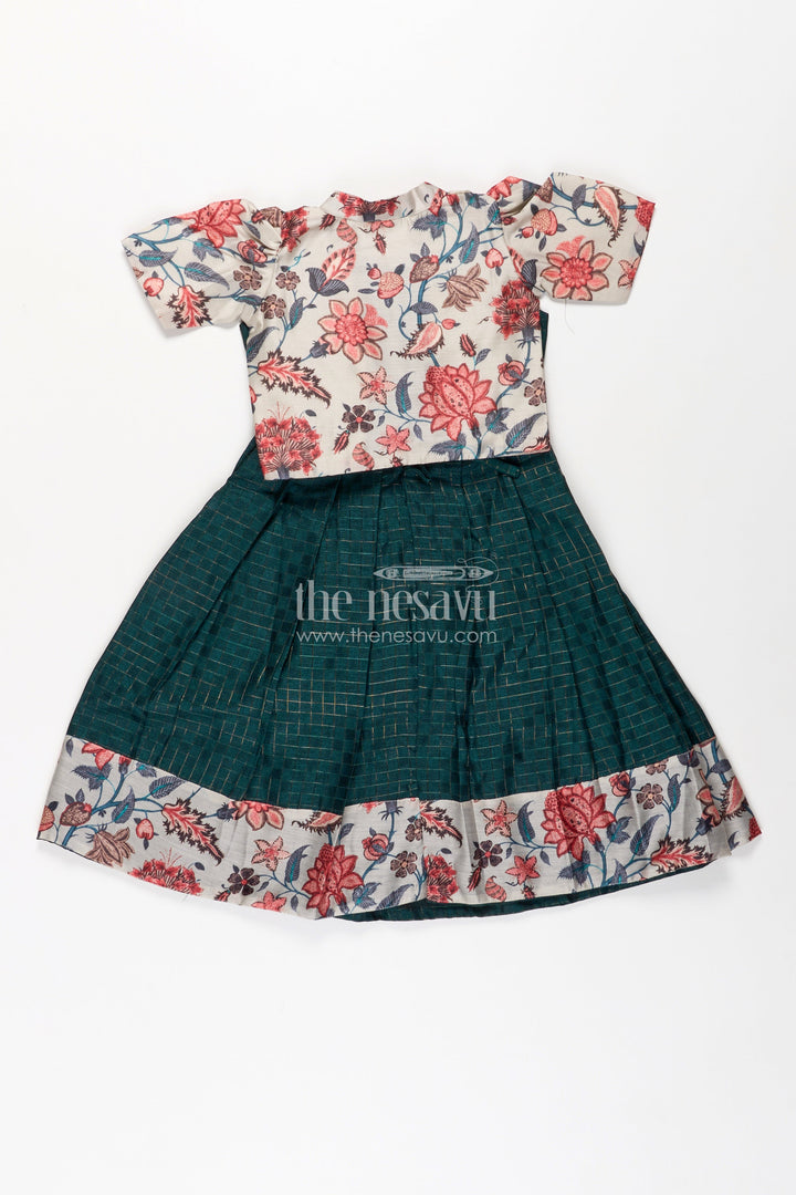 The Nesavu Girls Casual Gown Girls Silk Cotton Anarkali Gown with Floral Border and Overcoat in Green Anarkali Gown Style Nesavu Girls green anarkali gown Silk Cotton Floral Printed Overcoat Flared Pleats | The Nesavu