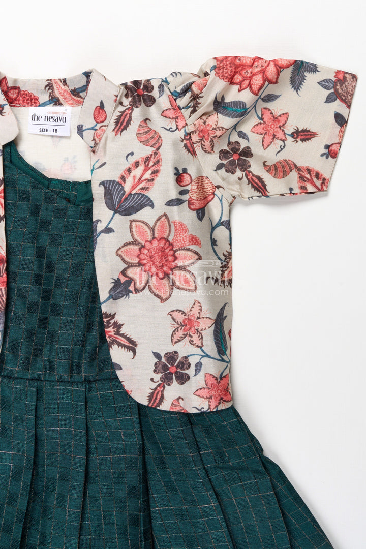 The Nesavu Girls Casual Gown Girls Silk Cotton Anarkali Gown with Floral Border and Overcoat in Green Anarkali Gown Style Nesavu 18 (2Y) / Green GA317A-18 Girls green anarkali gown Silk Cotton Floral Printed Overcoat Flared Pleats | The Nesavu