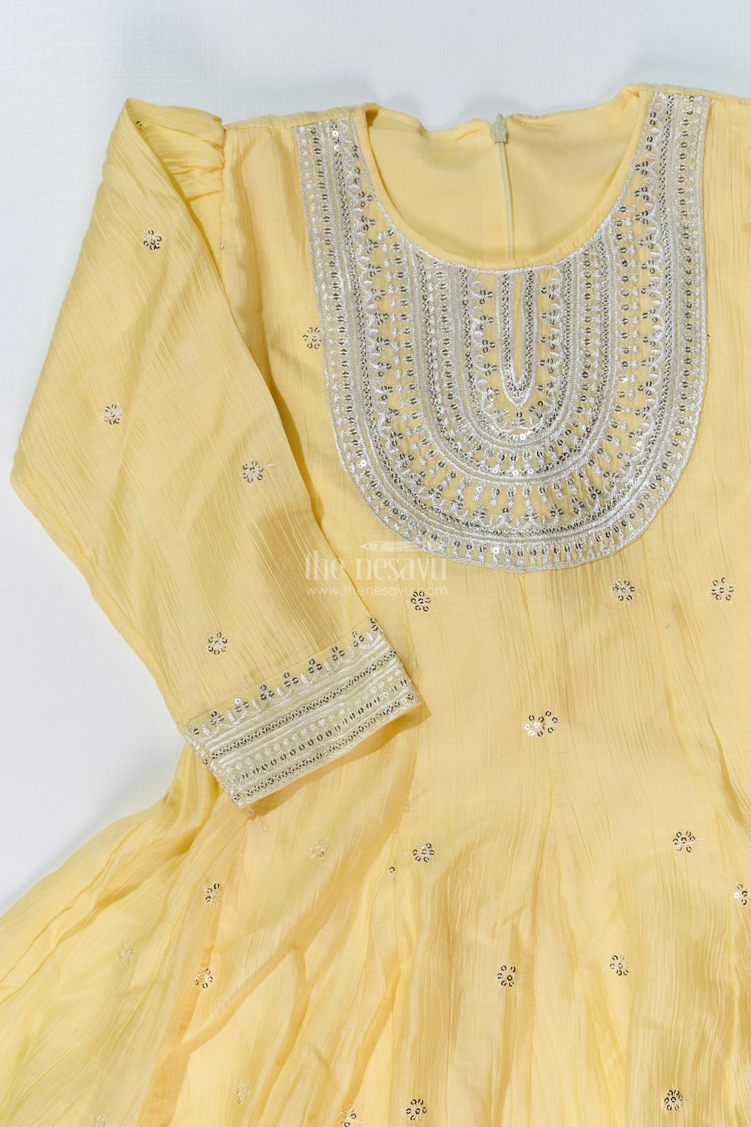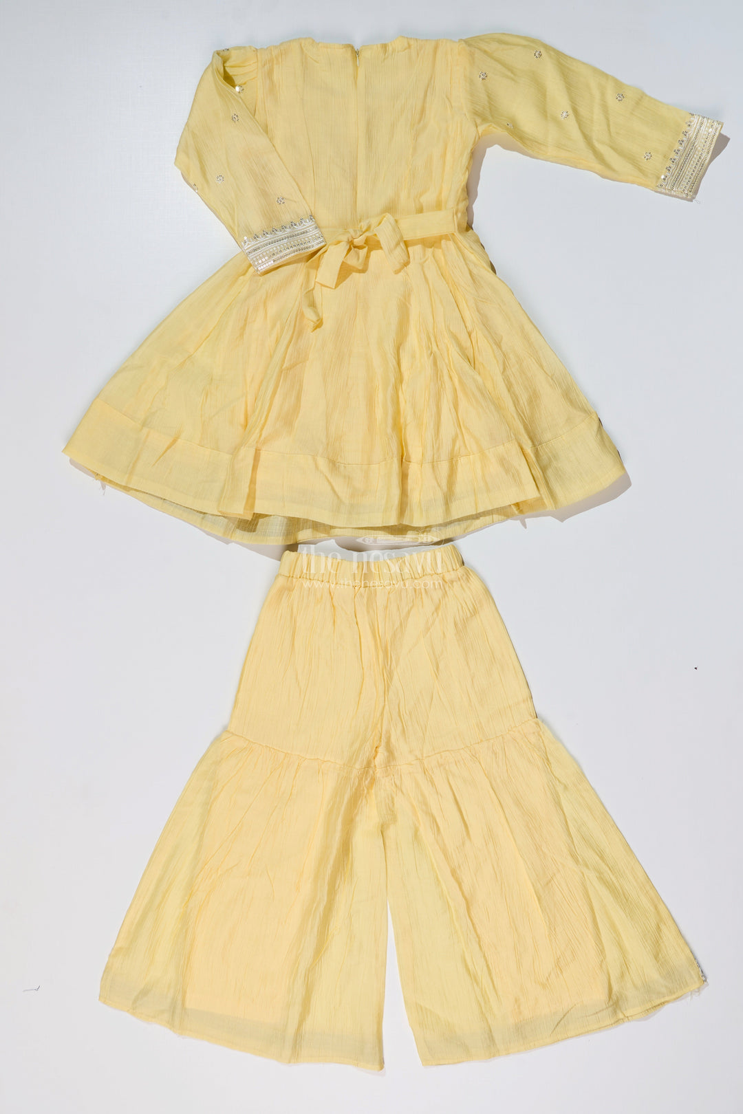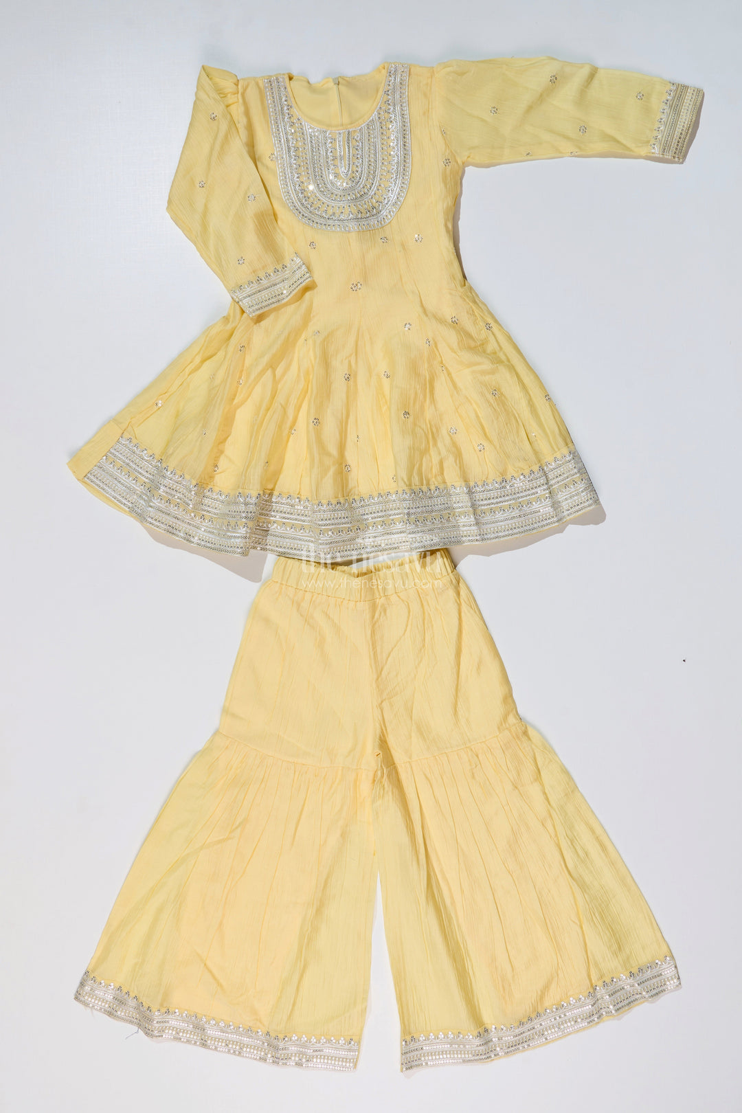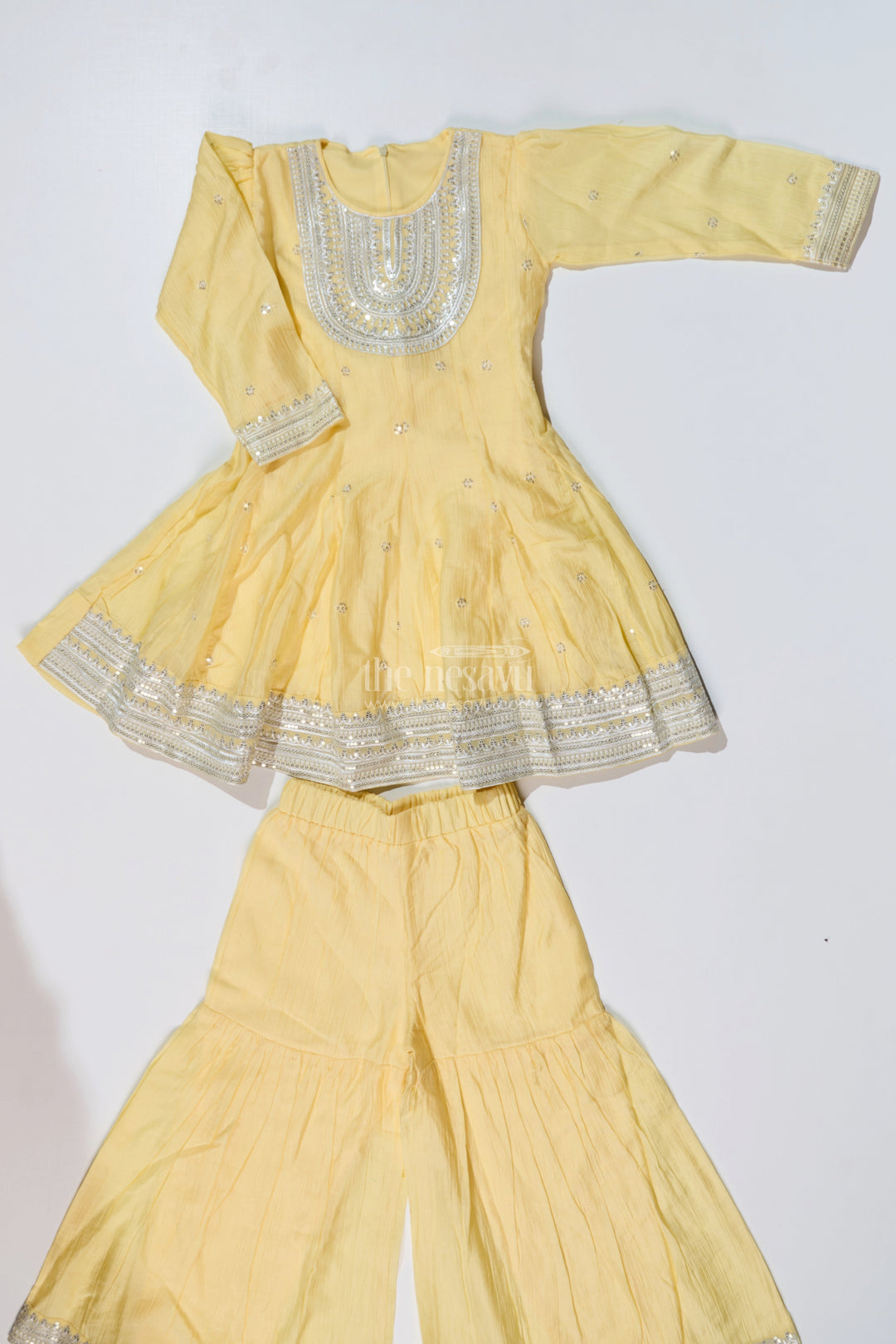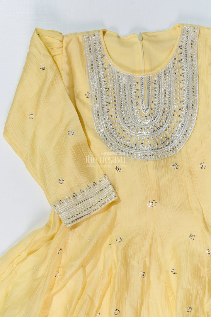 simple sharara suit is redefined with this cheerful yellow cotton set for girls, designed with elegance and ease in mind. The kurta features classic silver embellishments and a rounded neckline with a fully flared silhouette. The sharara pants and sleeve cuffs mirror the design with matching silver borders, adding festive sparkle. Crafted from breathable cotton, this ensemble offers freedom of movement and long-wear comfort, ideal for family functions or traditional celebrations. Its bright hue and timeless design make it a standout choice for joyful occasions.