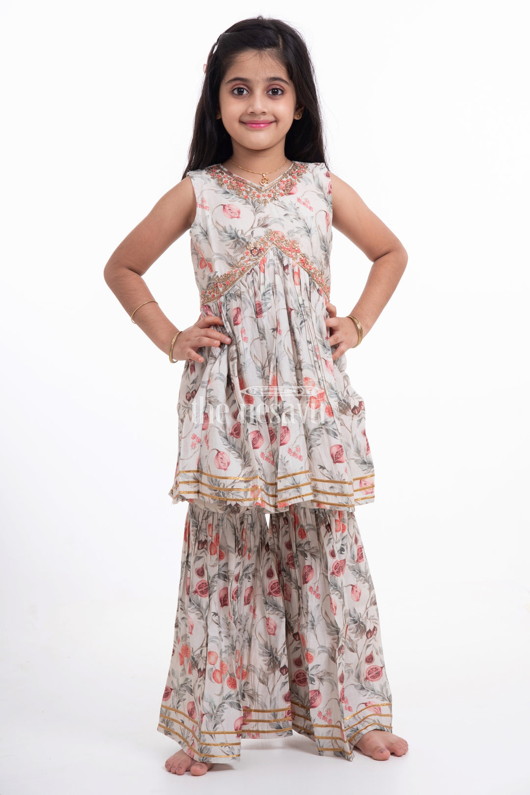 Celebrate Diwali and Navratri with this beautifully designed Nesavu Modal Silk Printed Sharara Choli Dress for girls. Featuring a lovely floral print and intricate hand embroidery, this outfit is perfect for festive occasions. Available in sizes for girls aged 1 to 10 years, this sharara choli dress combines elegance and comfort, making it a perfect choice for any celebration.