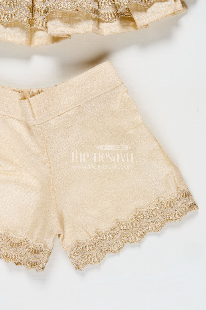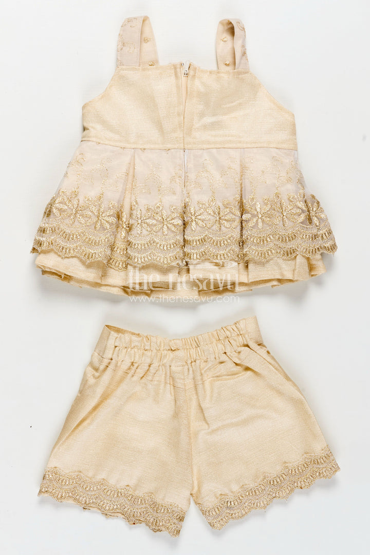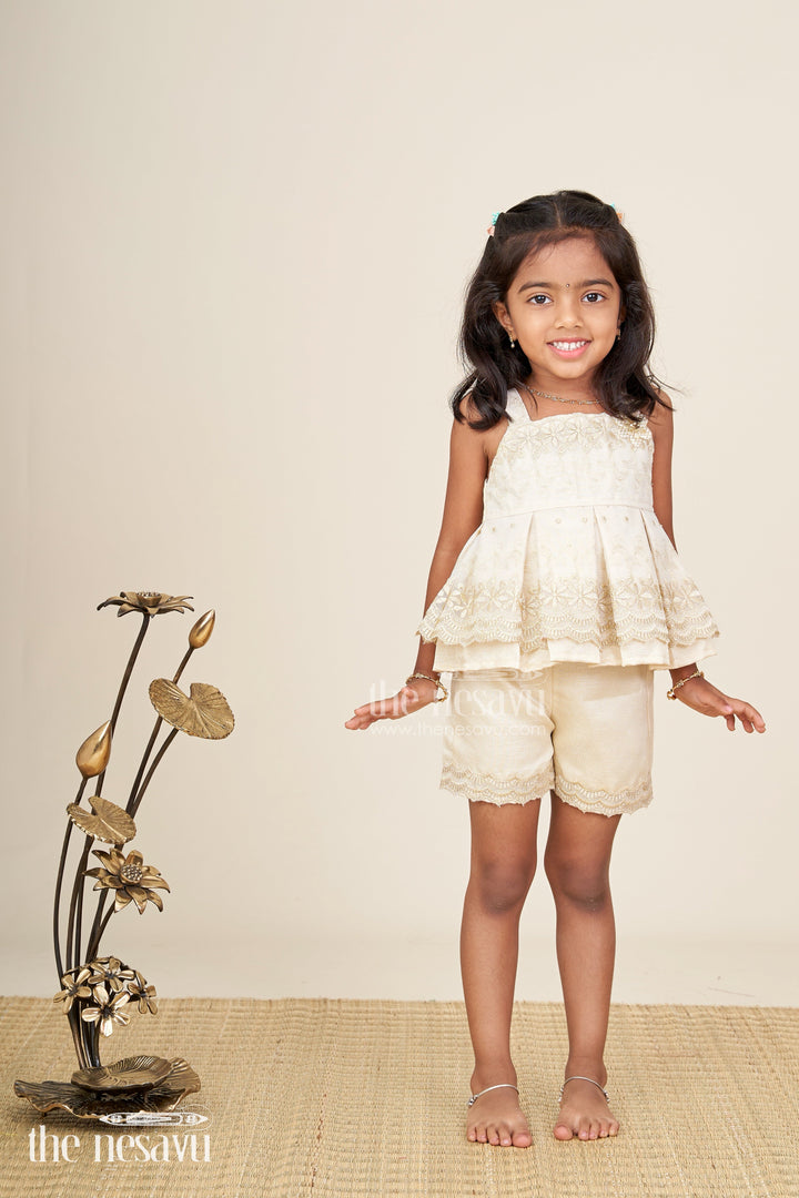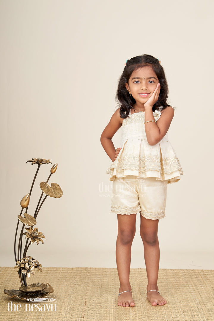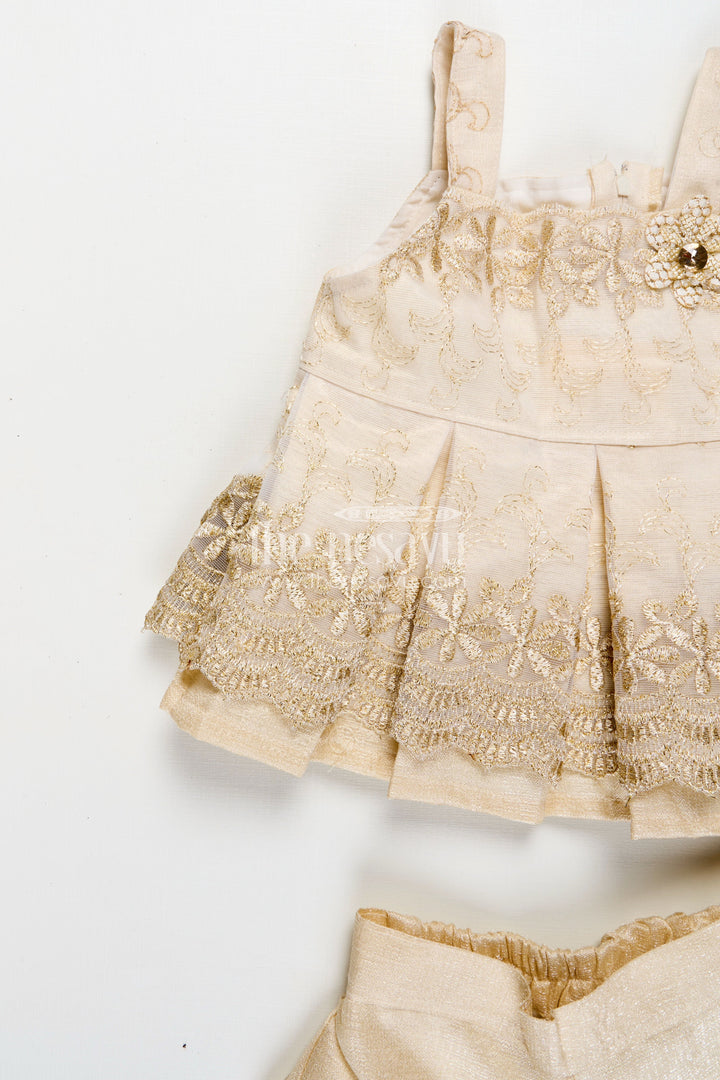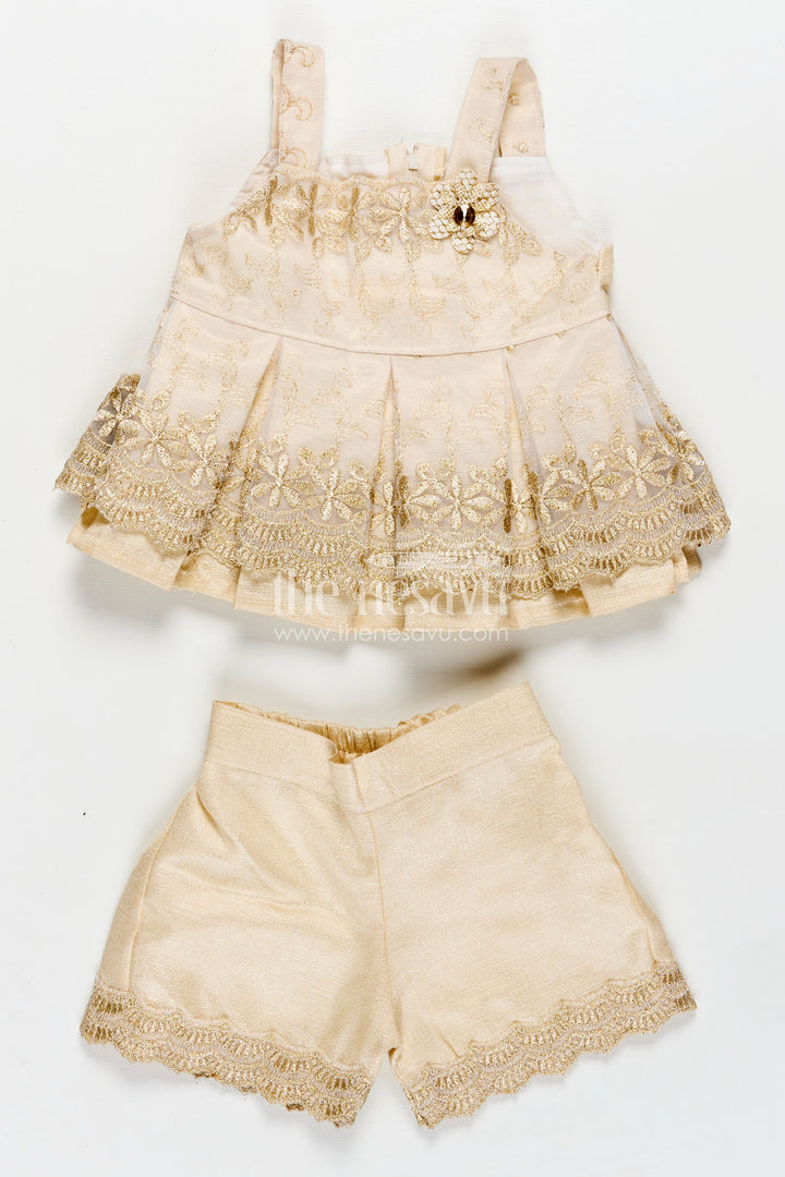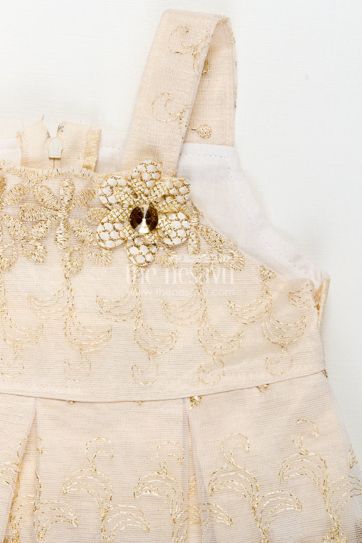 Newborn dresses reach a new level of elegance with this three-piece baby casual set, featuring a delicately embroidered top, matching shorts, and a cute headband. Designed in soft beige tones, this outfit combines comfort with sophistication. The soft net yoke of the sleeveless top showcases intricate thread embroidery in a floral motif, while the pleated hem adds a graceful flair. The shorts are tailored with subtle lace edging for a gentle, non-restrictive fit, perfect for little movers. Made for newborns who deserve both comfort and style, this outfit is ideal for daily wear, outings, or special moments. The headband completes the coordinated look, making this ensemble a charming addition to any baby’s early wardrobe.
