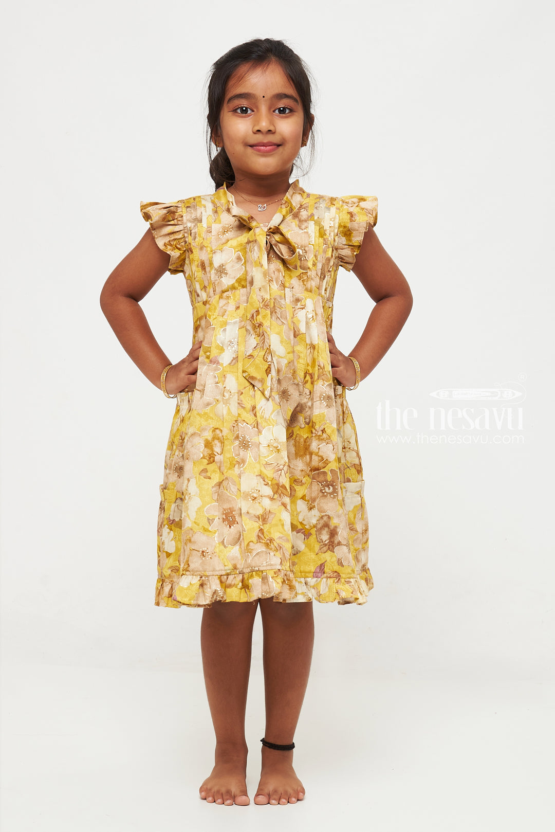Brighten up your child's summer wardrobe with this charming yellow floral dress. Made from lightweight glaze cotton, this dress is designed for comfort and style. The flutter sleeves and pleated design add a touch of elegance, while the front bow detail enhances its playful charm. Perfect for daily wear, this dress is ideal for casual outings, day-to-day activities, or as a comfortable change after festive events. The zipper back ensures easy dressing, making it a practical yet fashionable choice.