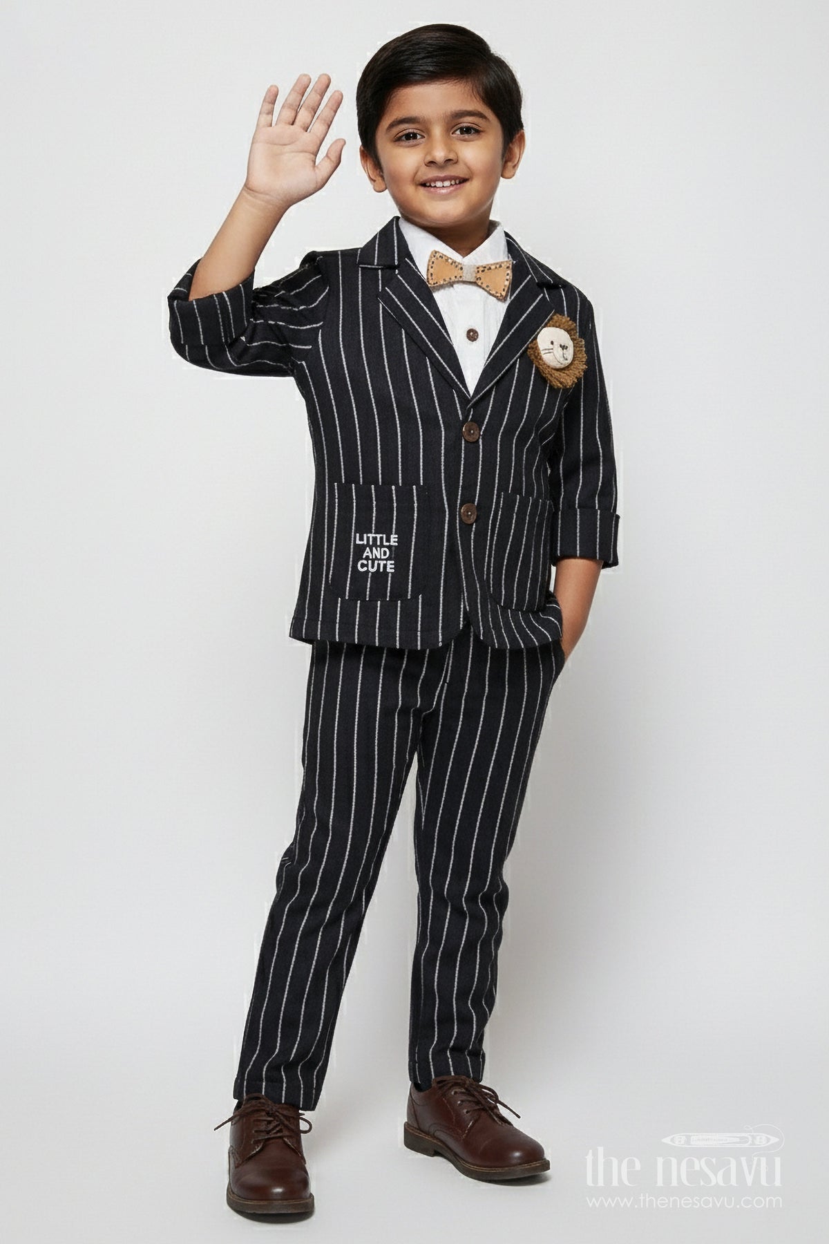 The Nesavu Boys Blazer Set Boys Cotton Stripe Blazer Outfit with Playful Embroidery and Bow Tie Nesavu 16 (1Y) / Black BCS488B-16 Nesavu boys striped cotton blazer set bow tie badge  party wear suit