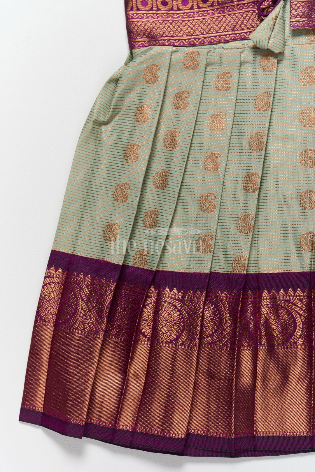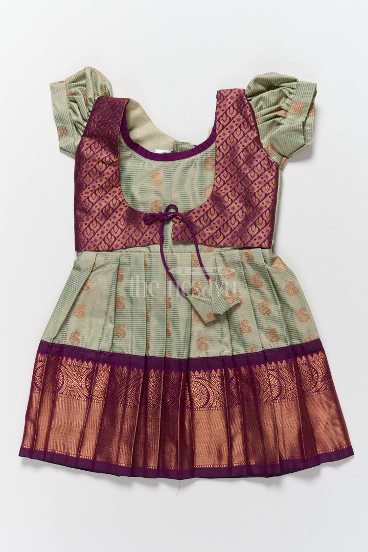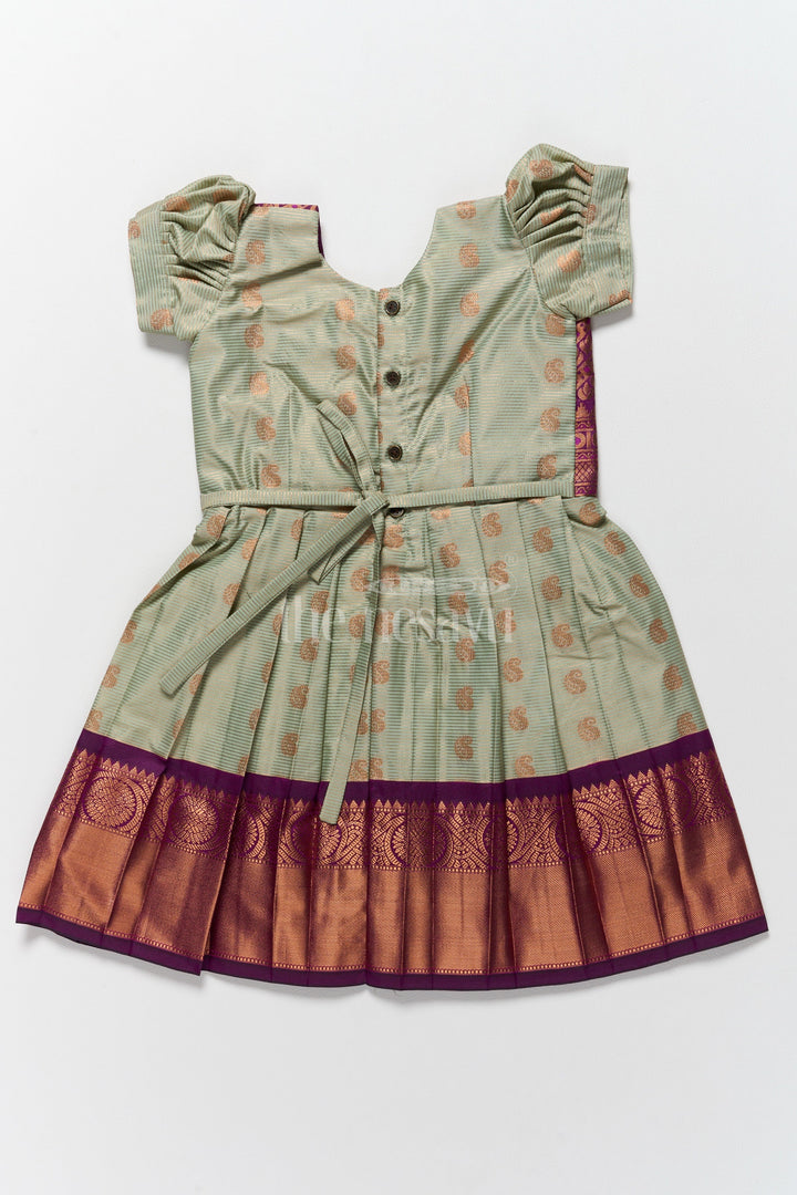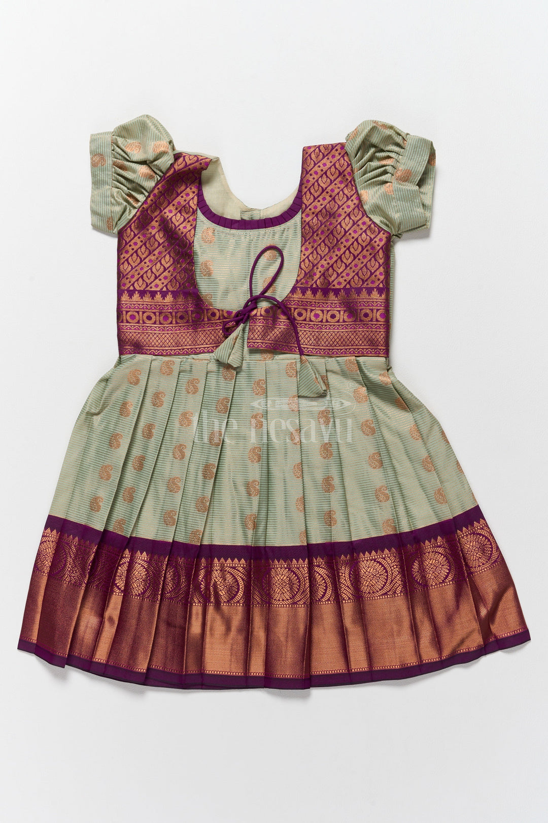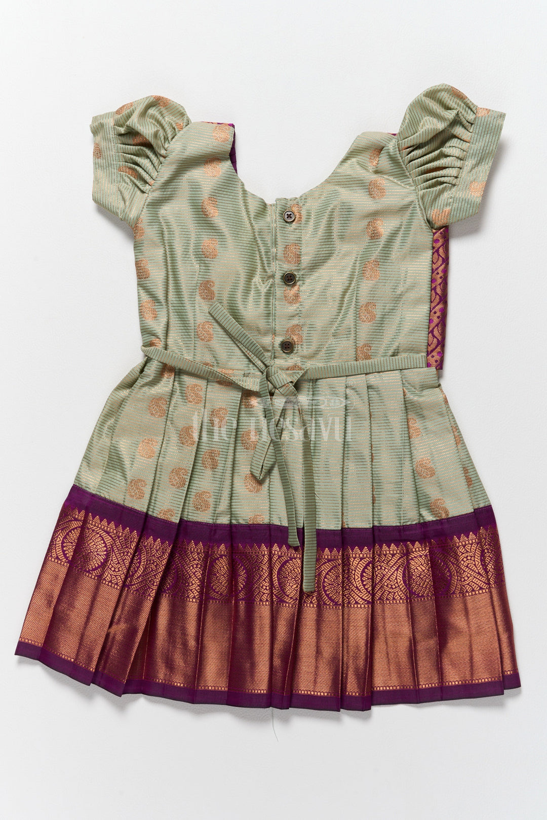 Celebrate traditions with this stunning new dress collection for Pongal. Crafted from premium blend silk, this frock features a delightful combination of soft green fabric adorned with elegant gold woven patterns. The charming purple brocade blouse overlay adds a regal touch, complemented by puff sleeves for a classic look. Its pleated skirt enhances movement and comfort, making it perfect for festivities. The back-tie closure ensures a snug fit, while the intricate zari work along the hemline adds a touch of sophistication. Ideal for traditional gatherings or family celebrations, this frock guarantees elegance and charm for your little one.