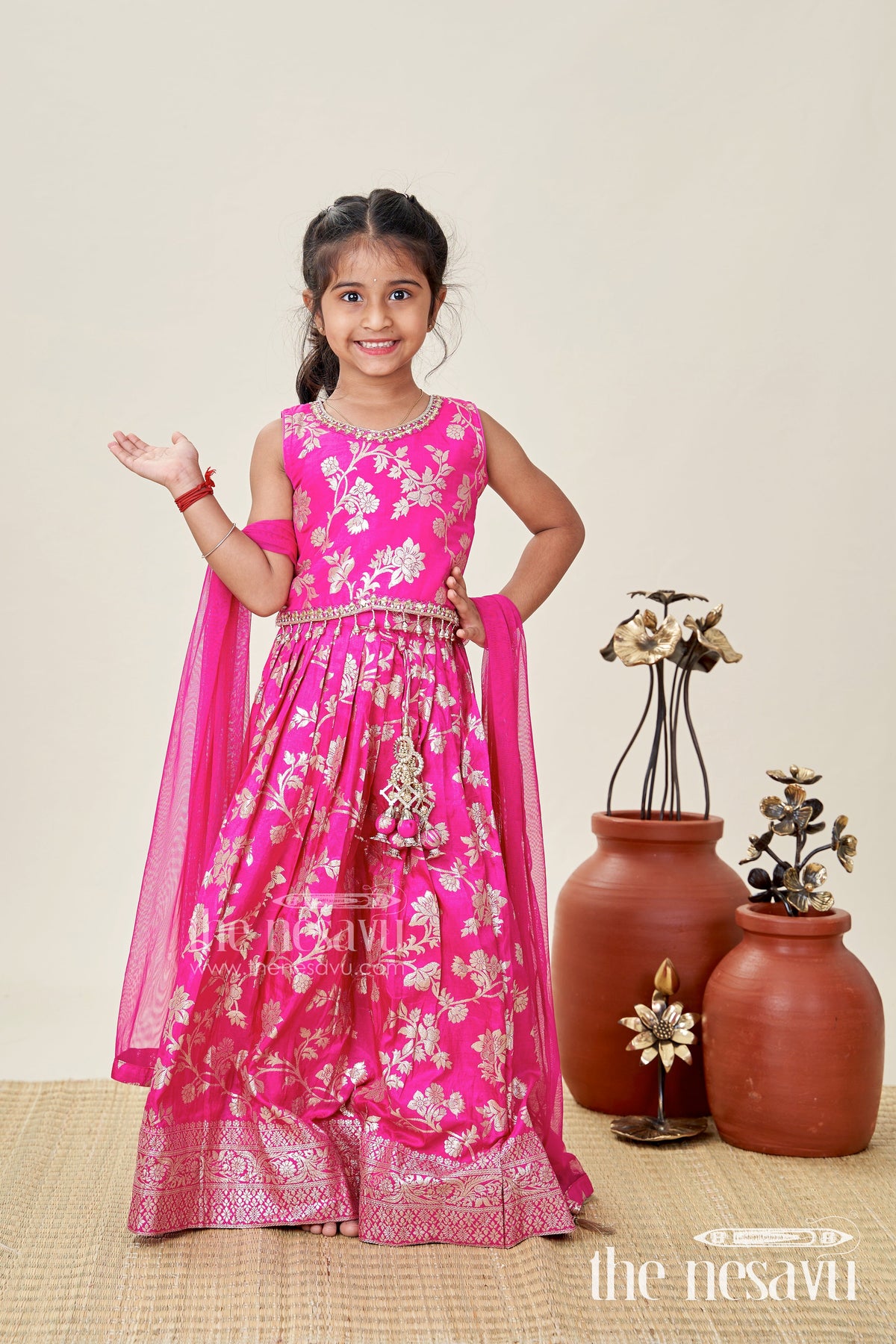 The Nesavu Girls Lehenga Choli Girls Semi Banaras Lehenga Dress Pink with Floral Jaal Weaving and Bead Trimmed Choli Nesavu Girls Pink Lehenga Dress Semi Banaras Floral Jacquard Beaded Choli Matching Dupatta | The Nesavu
