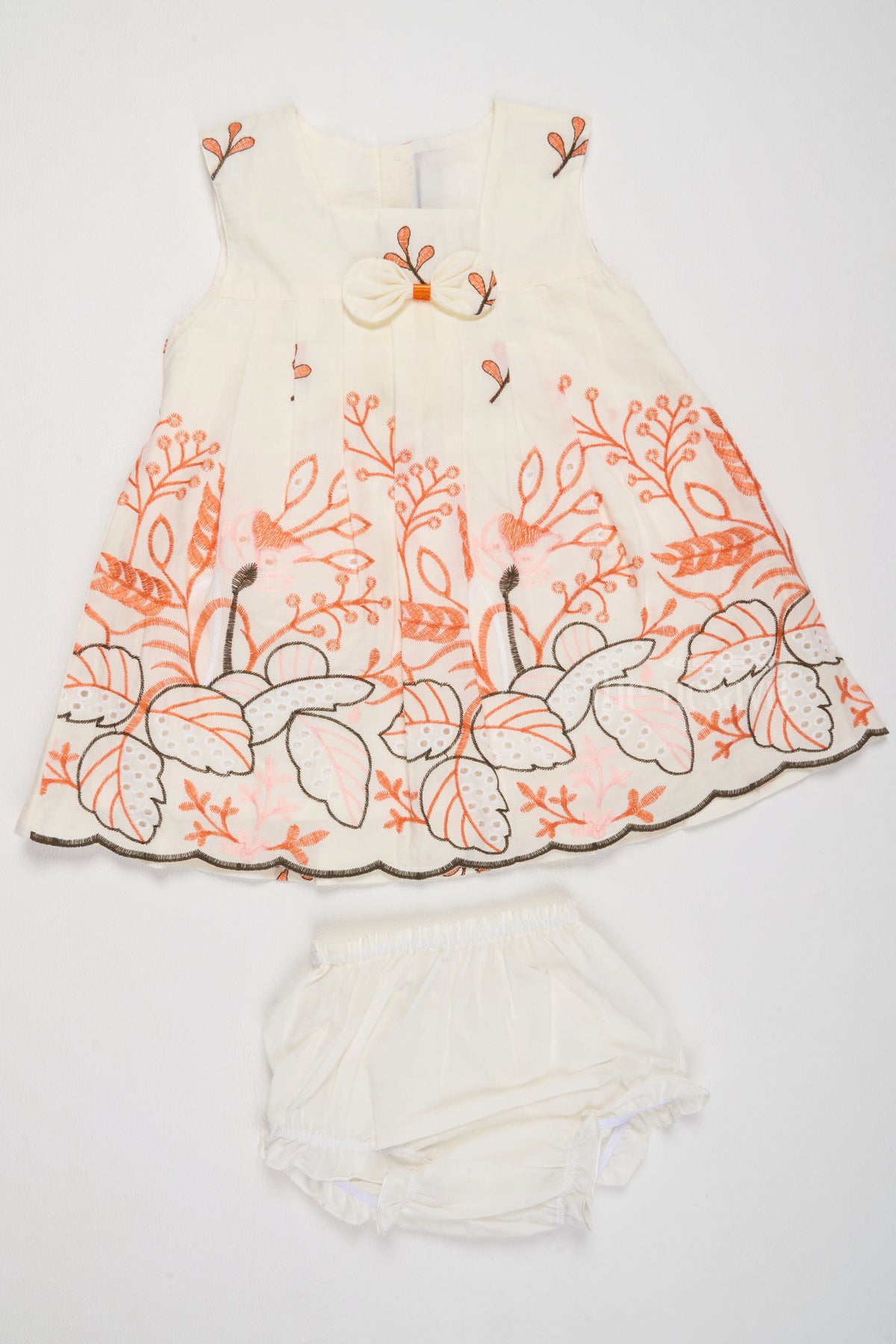 Introducing the latest newborn baby girl clothes, a charming and delicately designed outfit perfect for little ones. This dress showcases intricate floral embroidery in vibrant orange tones, set against a soft and breathable white fabric that ensures maximum comfort for your baby. The beautifully detailed bow on the bodice adds a touch of elegance, while the pleated design enhances the outfit's style. Designed for newborns aged 12 to 18 months, this dress comes with a matching bloomer that completes the adorable look. Whether it's a casual day out or a family gathering, this outfit ensures your baby looks cute and feels cozy. A perfect addition to your baby's wardrobe for daily wear or special outings.