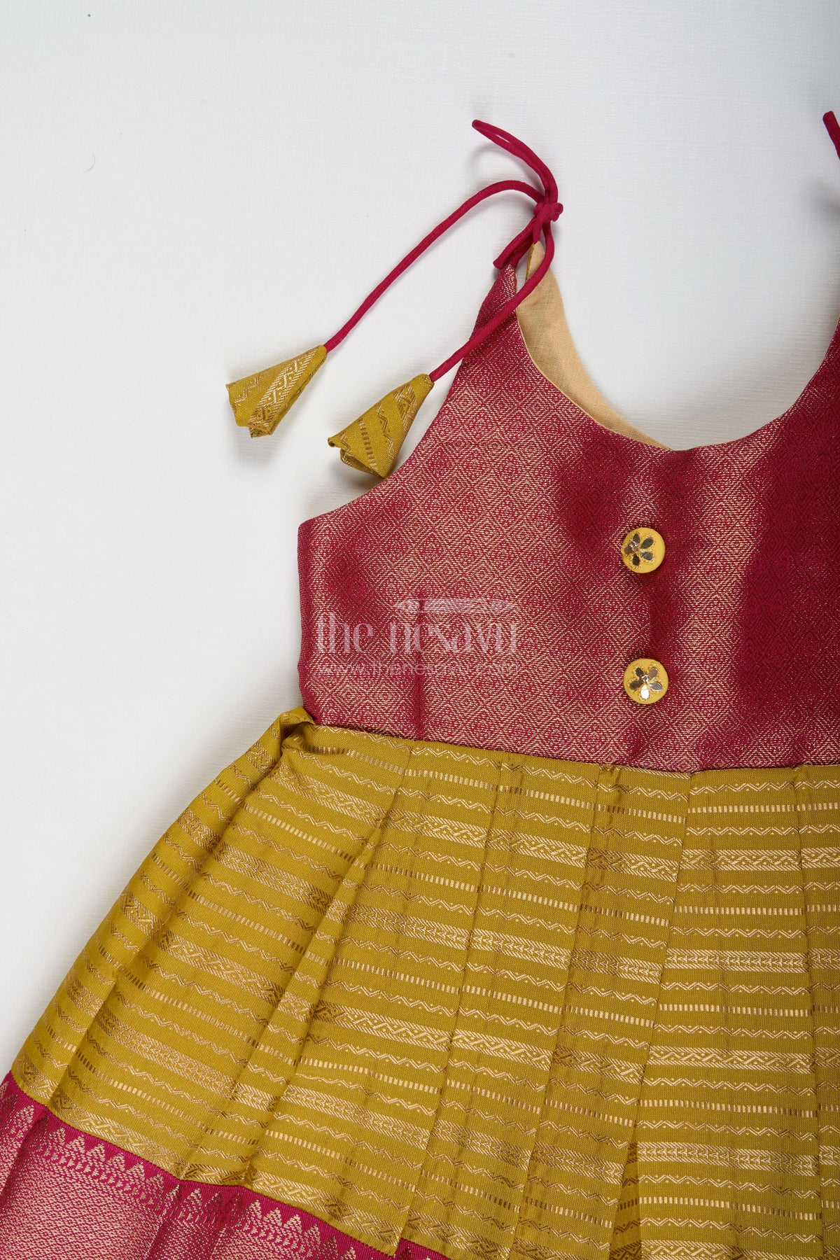 The Nesavu Tie-up Frock Traditional Tie-Up Frock for Baby Girls in Mustard and Pink Perfect for Weddings Nesavu 16 (1Y) / Red / Style 1 SF994CA-16 Nesavu Mustard And Pink Baby Girl Silk Frock Ethnic Tie-Up Dress For Weddings