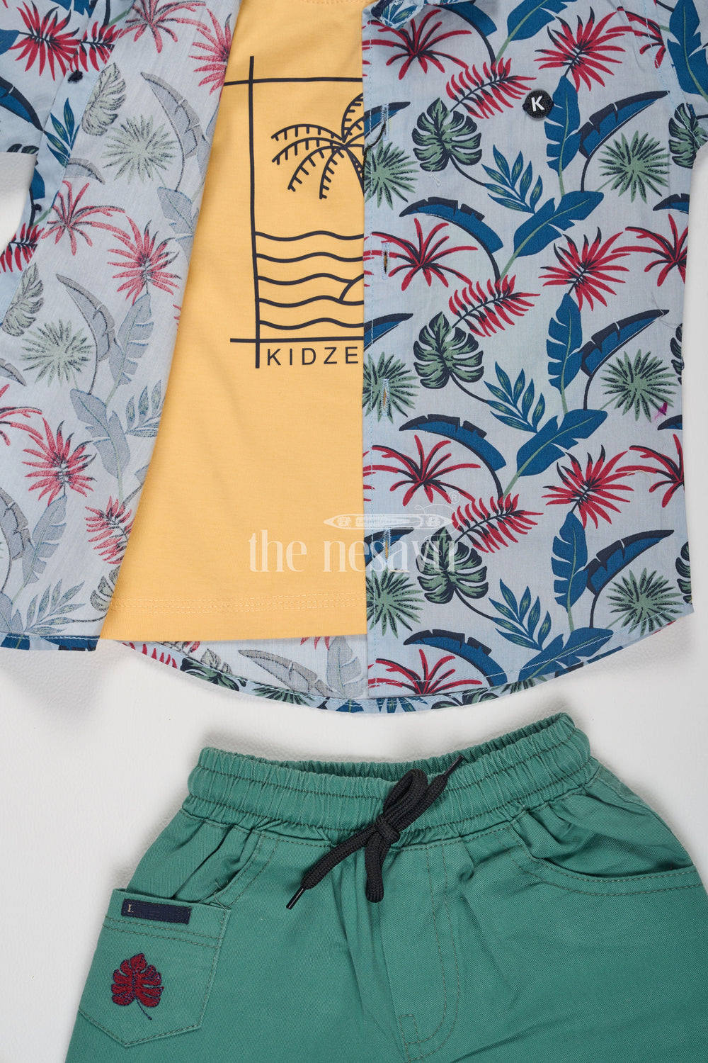 The Nesavu Boys Casual Set Tropical Gray Half Sleeve Shirt and Green Shorts Set for Boys Nesavu Tropical Gray Half Sleeve Shirt and Green Shorts Set for Boys - Nesavu