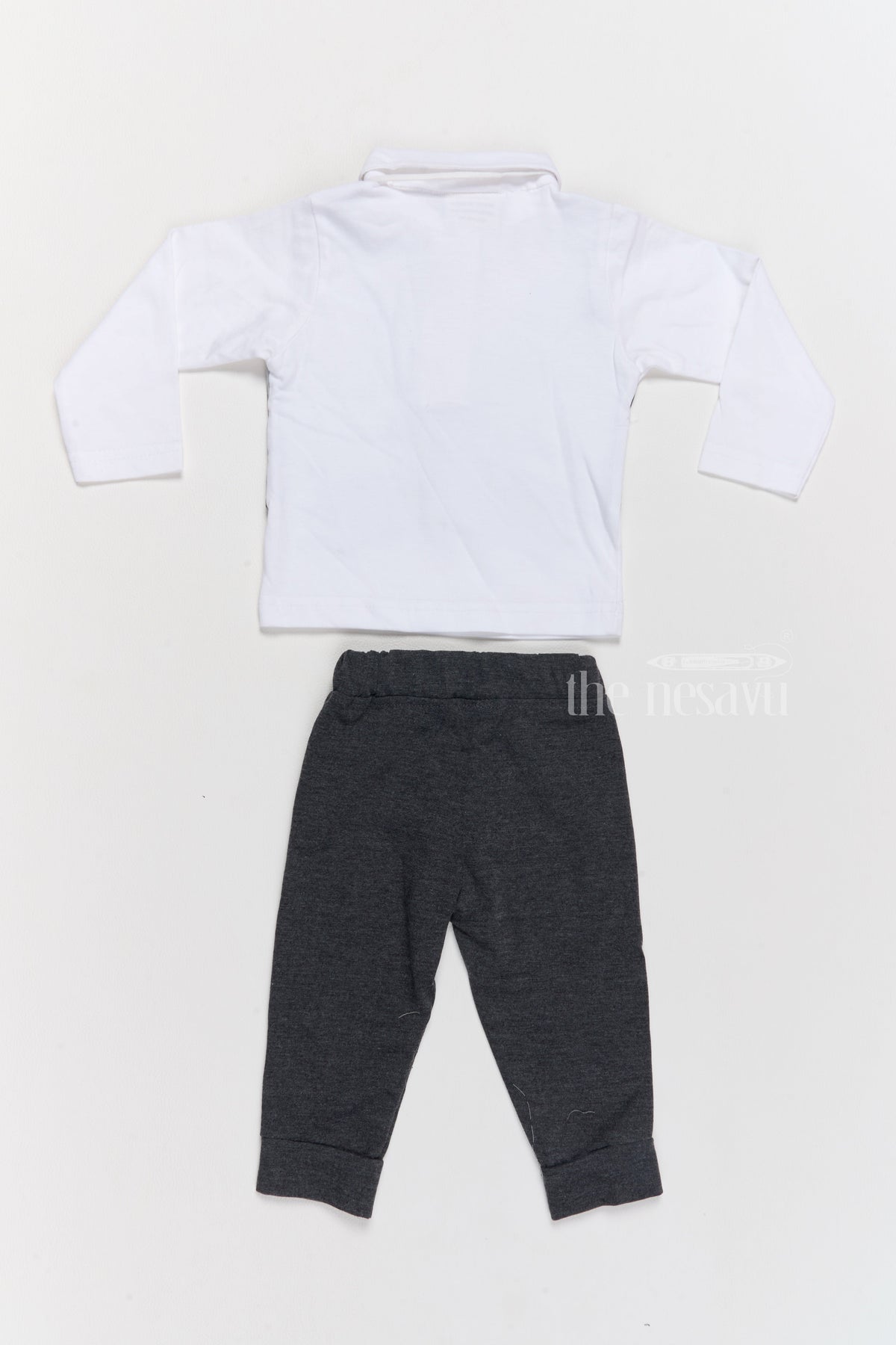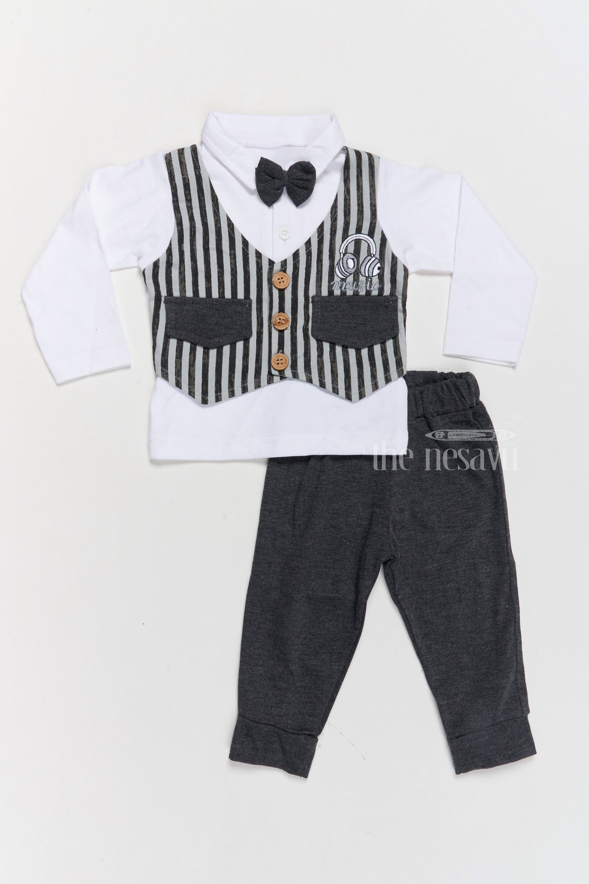 Keep your little one warm and stylish with this cozy two-piece cotton winter outfit. The set includes a white full-sleeve shirt featuring a chic striped vest design with wooden button details and an adorable bowtie, paired with black elasticated pants for added comfort. The soft, breathable cotton fabric ensures your infant stays comfortable throughout the day. This versatile outfit is perfect for winter outings, family gatherings, or casual events.
