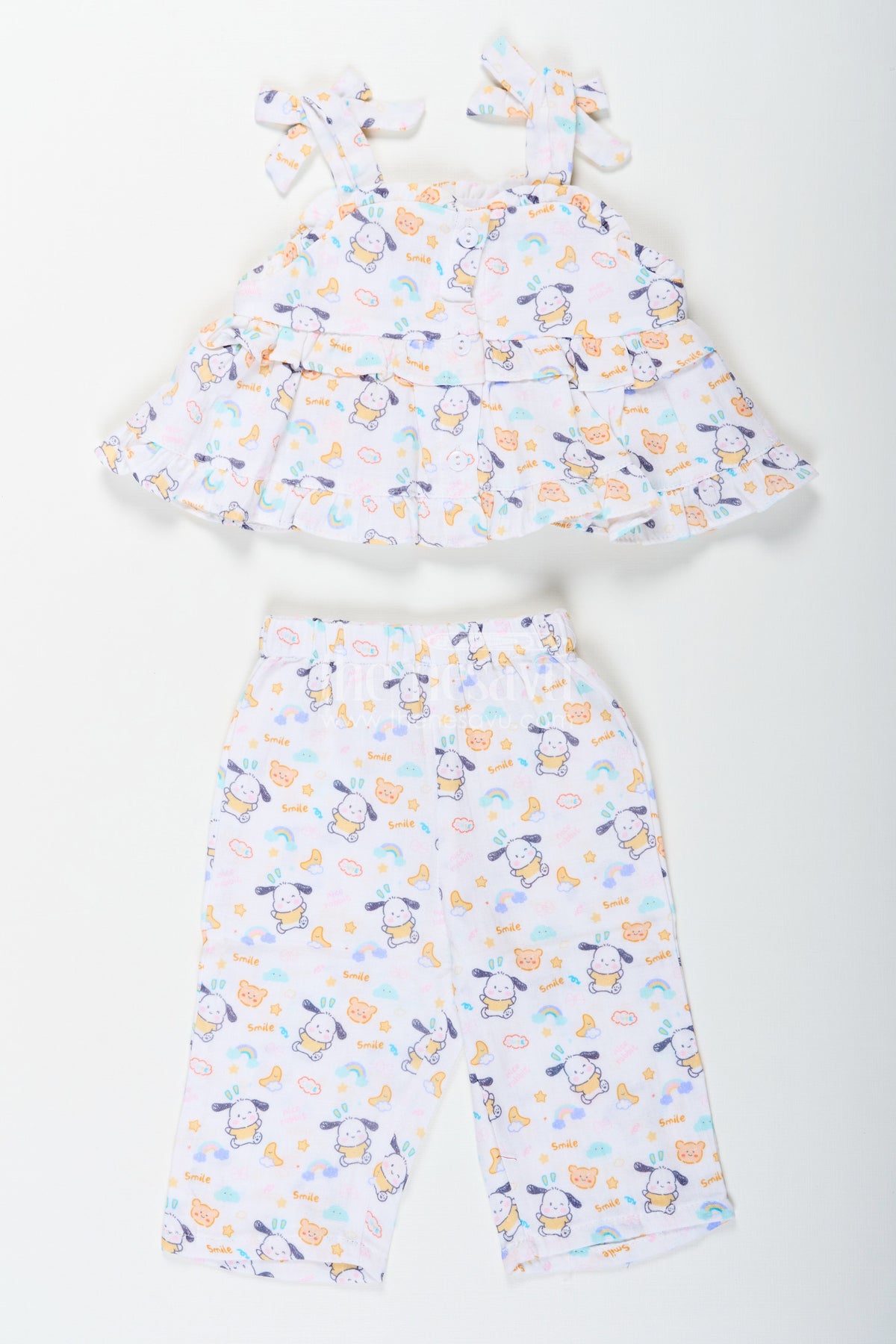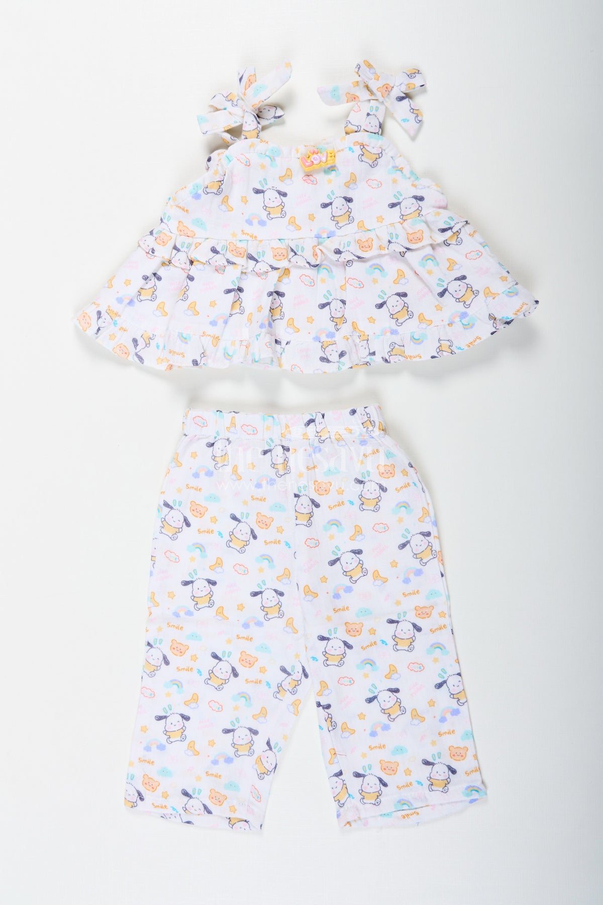 Fashionable sharara sets are a fun and breezy choice for everyday wear, and this adorable muslin outfit ticks all the right boxes. Featuring a double-layered ruffle top with playful shoulder ties, and a matching sharara pant, the digital print design is bursting with cheerful characters and colorful details. Crafted from lightweight muslin fabric, it keeps your little one cool and comfortable all day long. The soft elastic waistband adds ease to movement, making it perfect for both lounging and outings. This charming co-ord set is a must-have for stylish little girls who love comfort with a touch of whimsy.