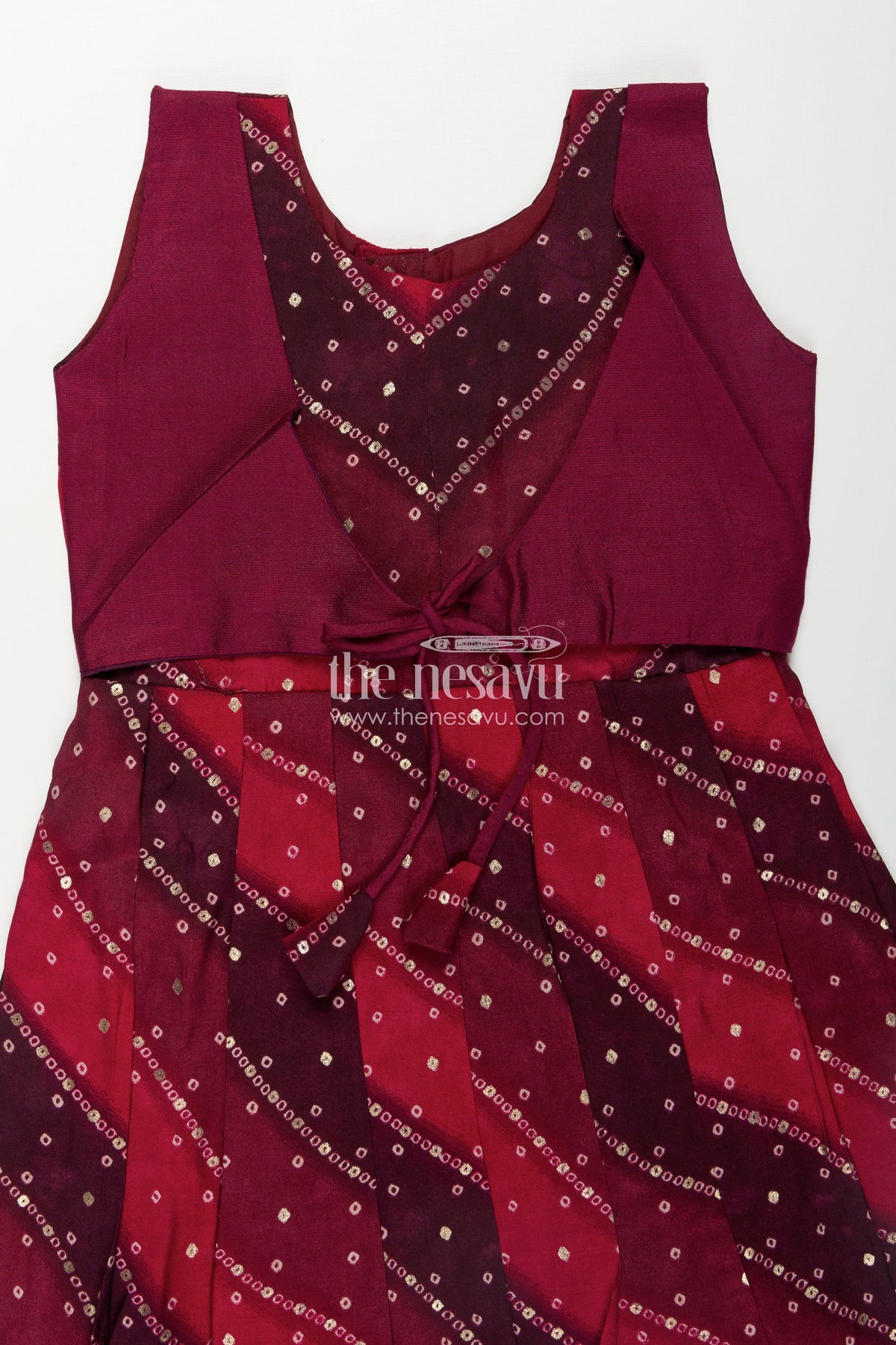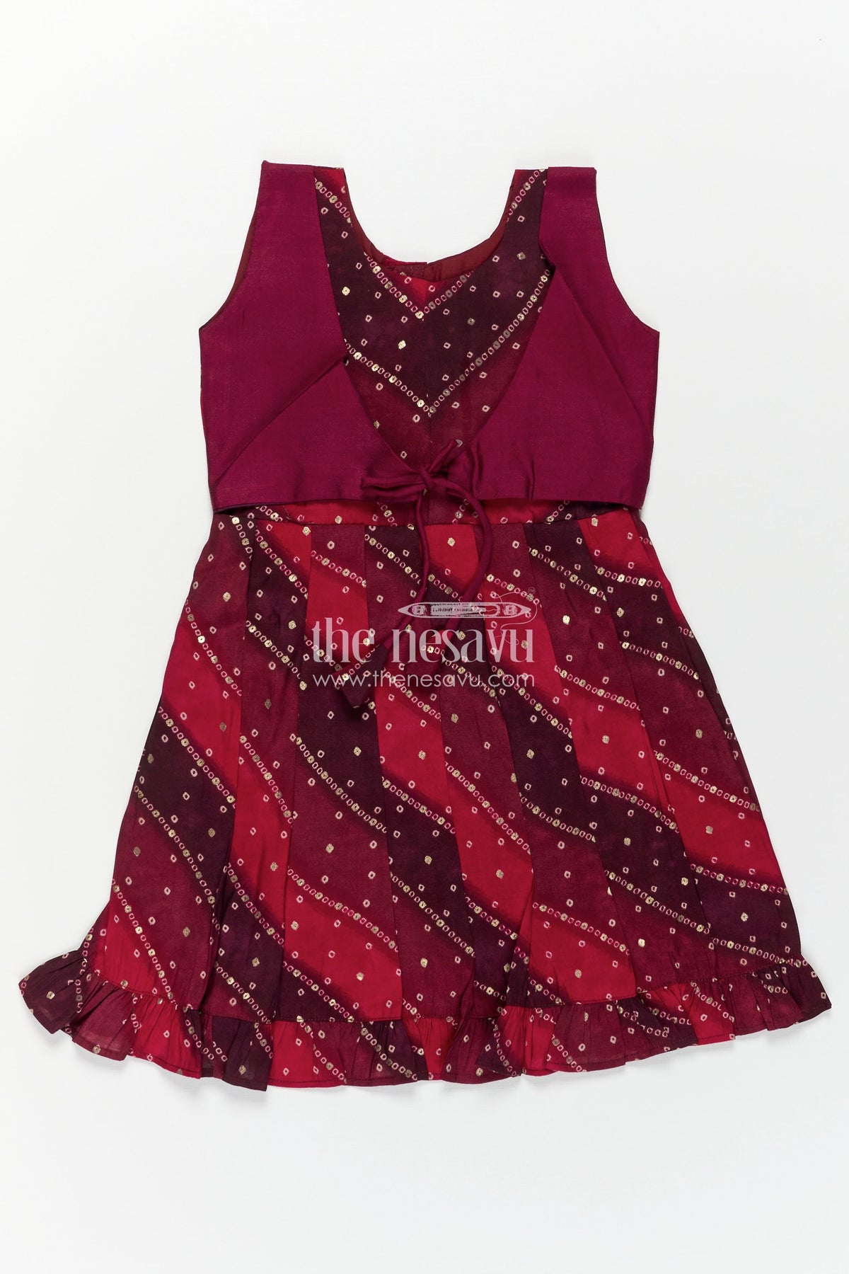 Turn heads with this vibrant long frock party style dress from Nesavu. Crafted from rich printed viscose, the frock features bold maroon shades blended with black and pink, adorned with intricate mirror prints for a touch of sparkle. A fitted bodice with a contrasting wrap effect and a front tie belt gives it a refined silhouette that ensures comfort without sacrificing style. The sleeveless cut and gentle flare enhance its party-ready appeal, making it perfect for birthdays, family gatherings, or festive wear. Lightweight and elegant, this long frock delivers lasting comfort and vibrant visual appeal in one polished package.