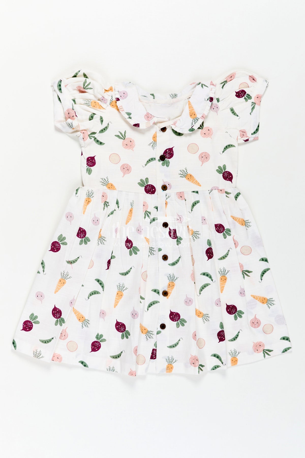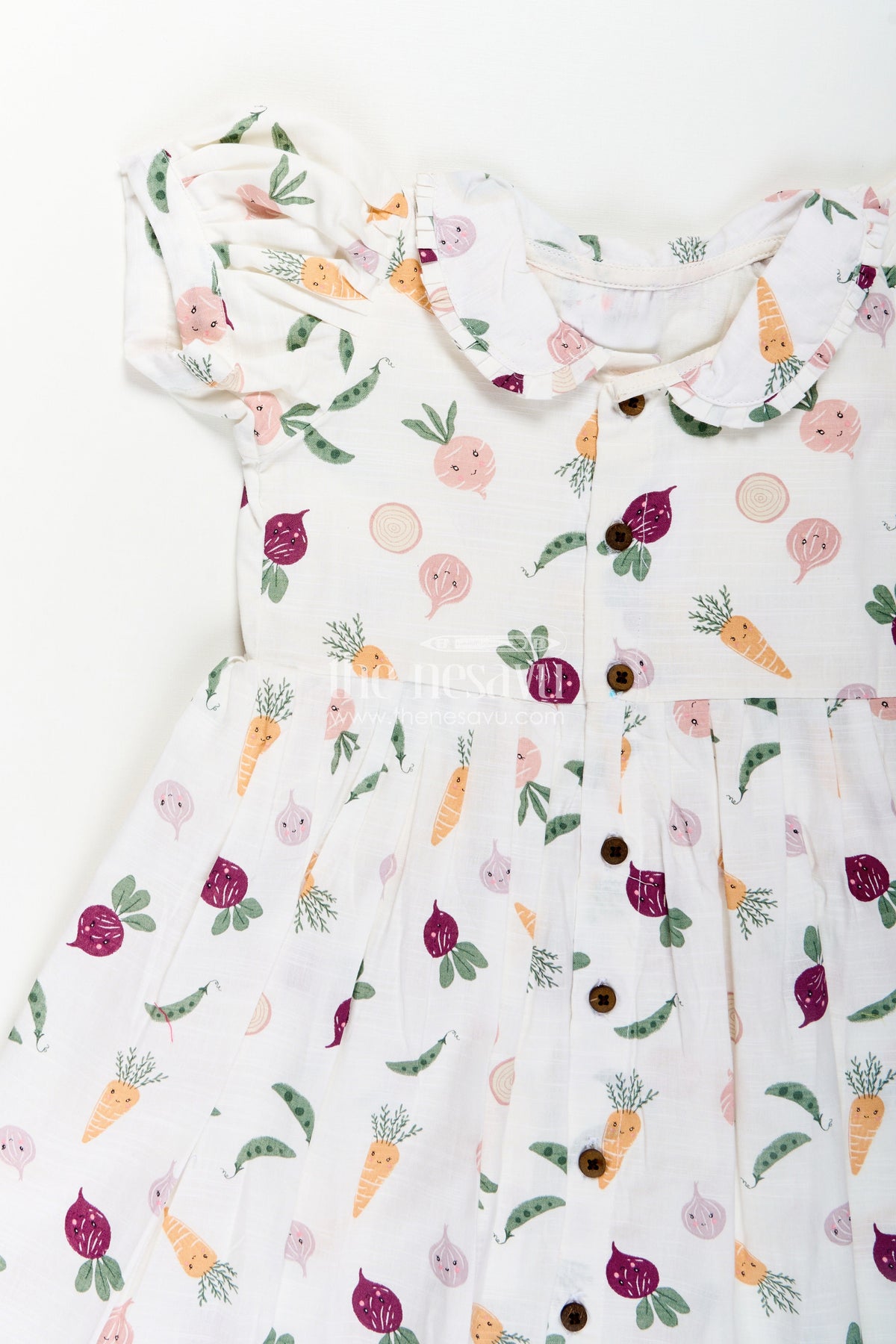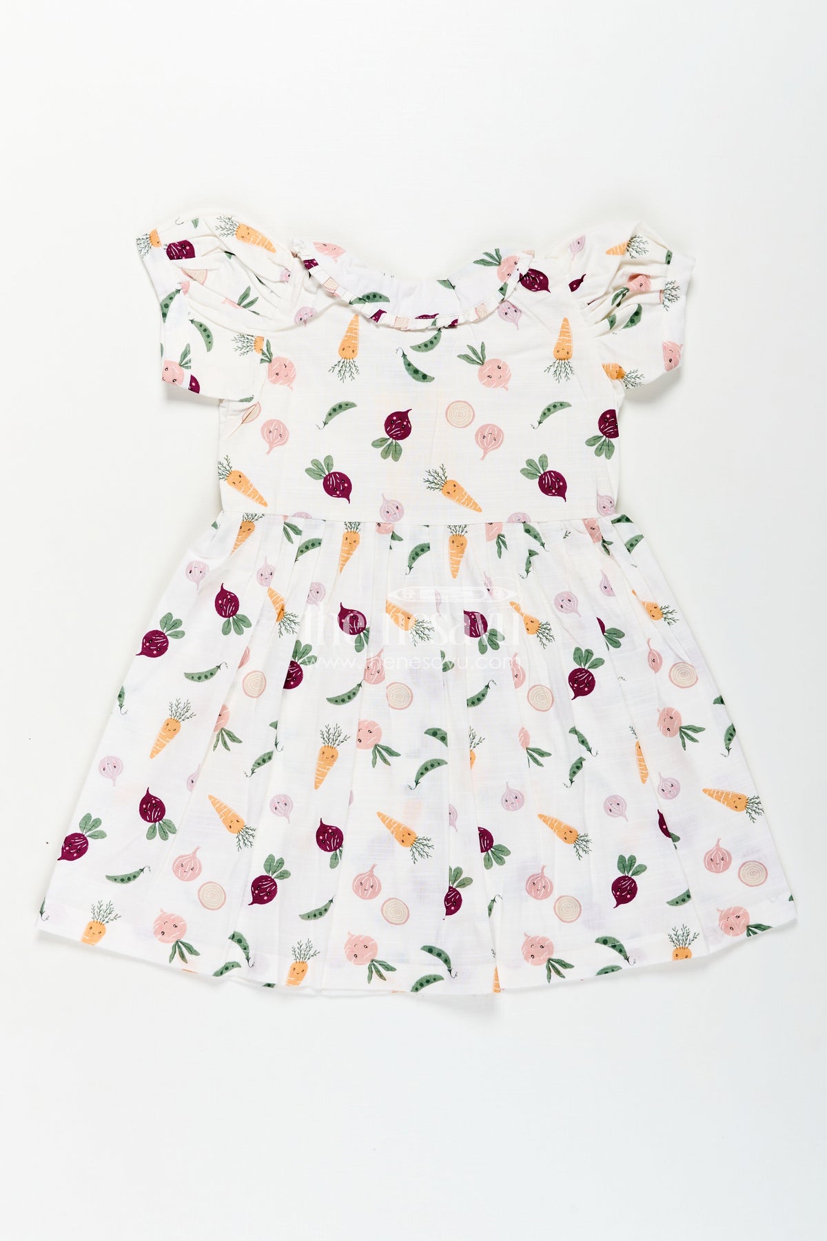 The Nesavu Girls Cotton Frock Girls White Cotton Dress with Allover Digital Print and Puff Sleeves Featuring Playful Vegetable Patterns Nesavu Girls White Cotton Dress Vegetable Print Allover Digital Design Everyday Comfort | The Nesavu