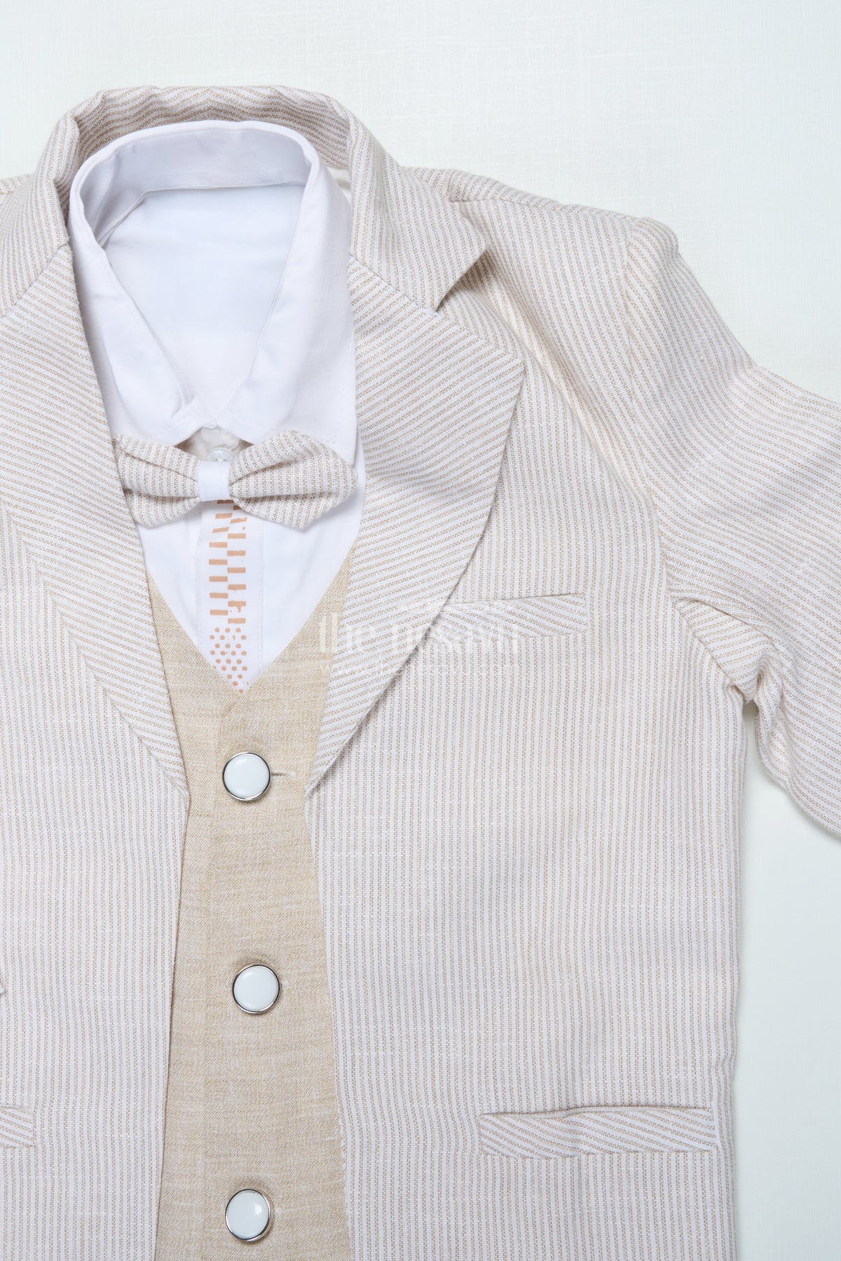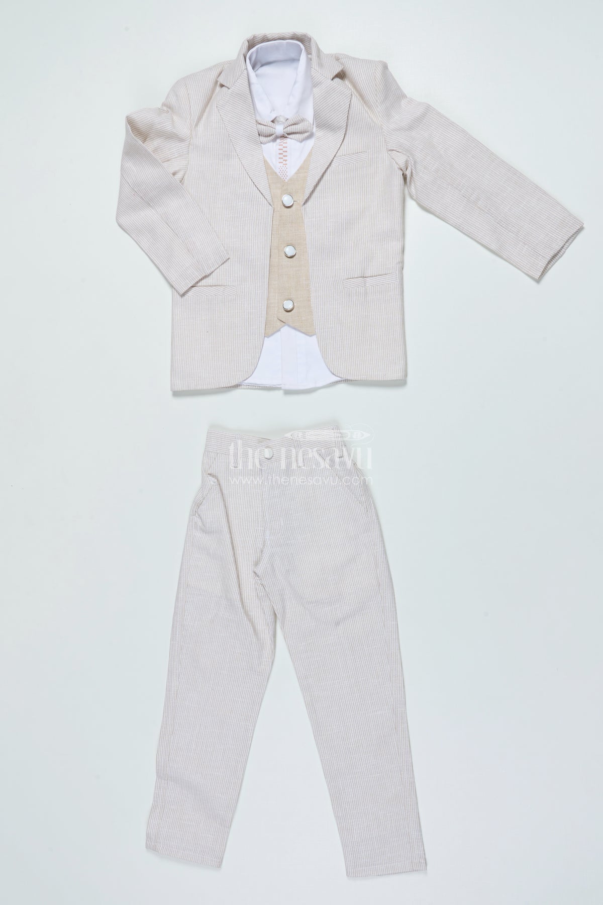 • This dapper boys blazer set includes a cotton striped jacket, shirt, and formal trousers