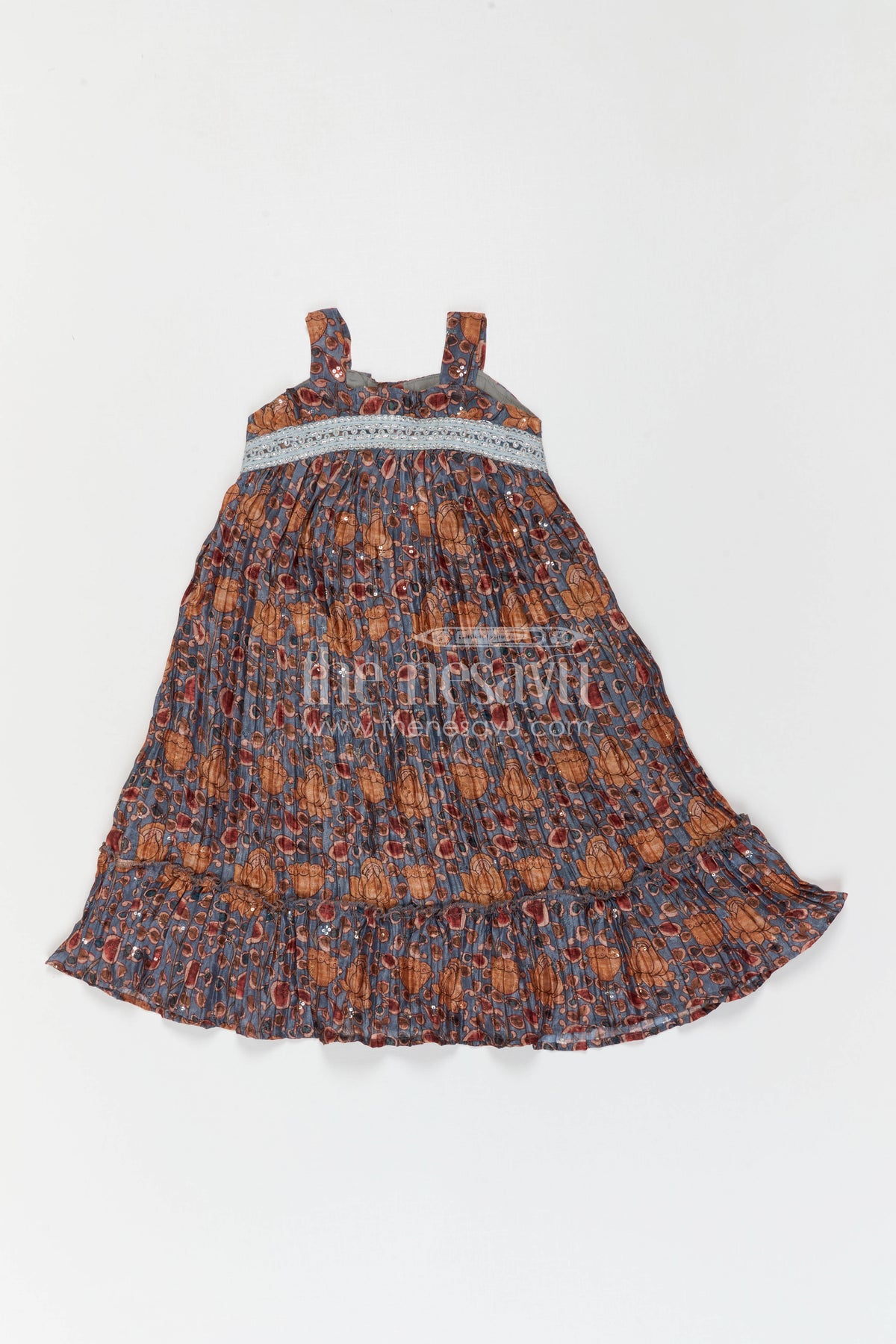 - This baby girl frock for festive outings is crafted from viscose pleated silk blend with rich digital prints