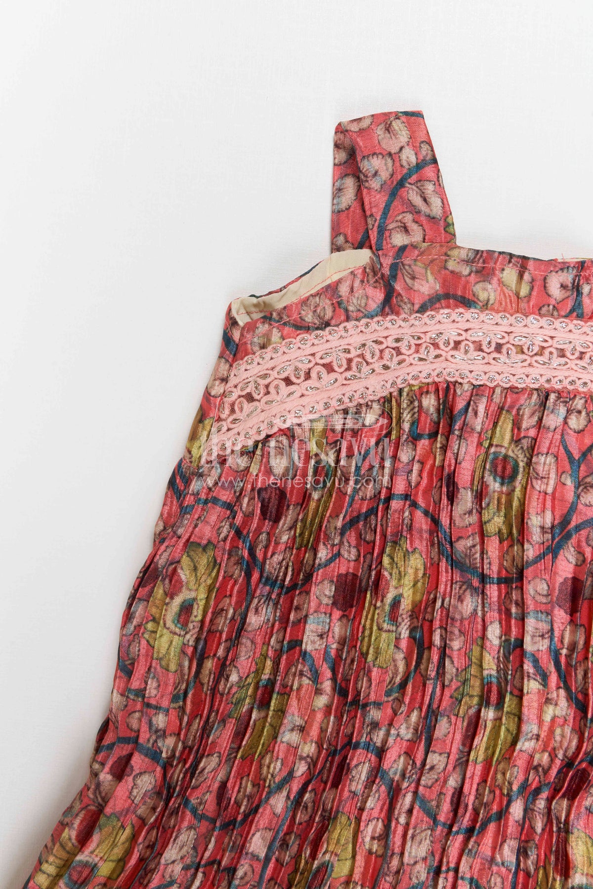 - Design: Pleated fabric, Lace yoke, Flared hem