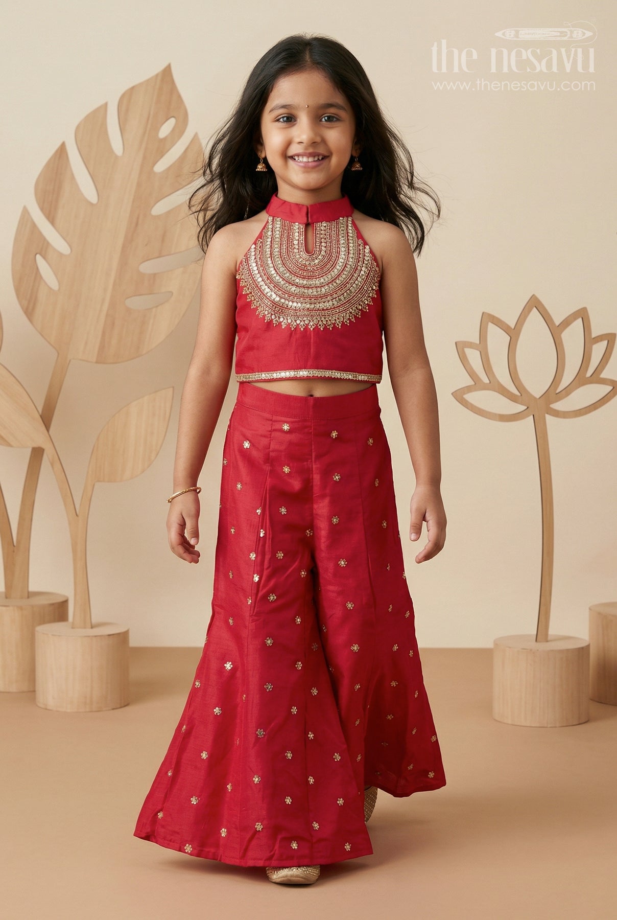 The Nesavu Girls Sharara / Plazo Set Girls Sharara Set for Weddings and Cultural Events Nesavu Nesavu Girls Sharara Set For Weddings With Modal Silk And Designer Embroidery Yoke Red Festive Outfit