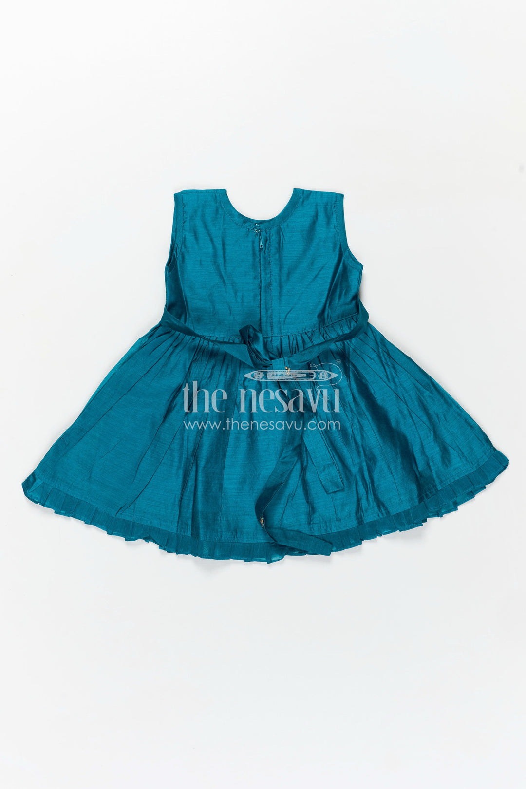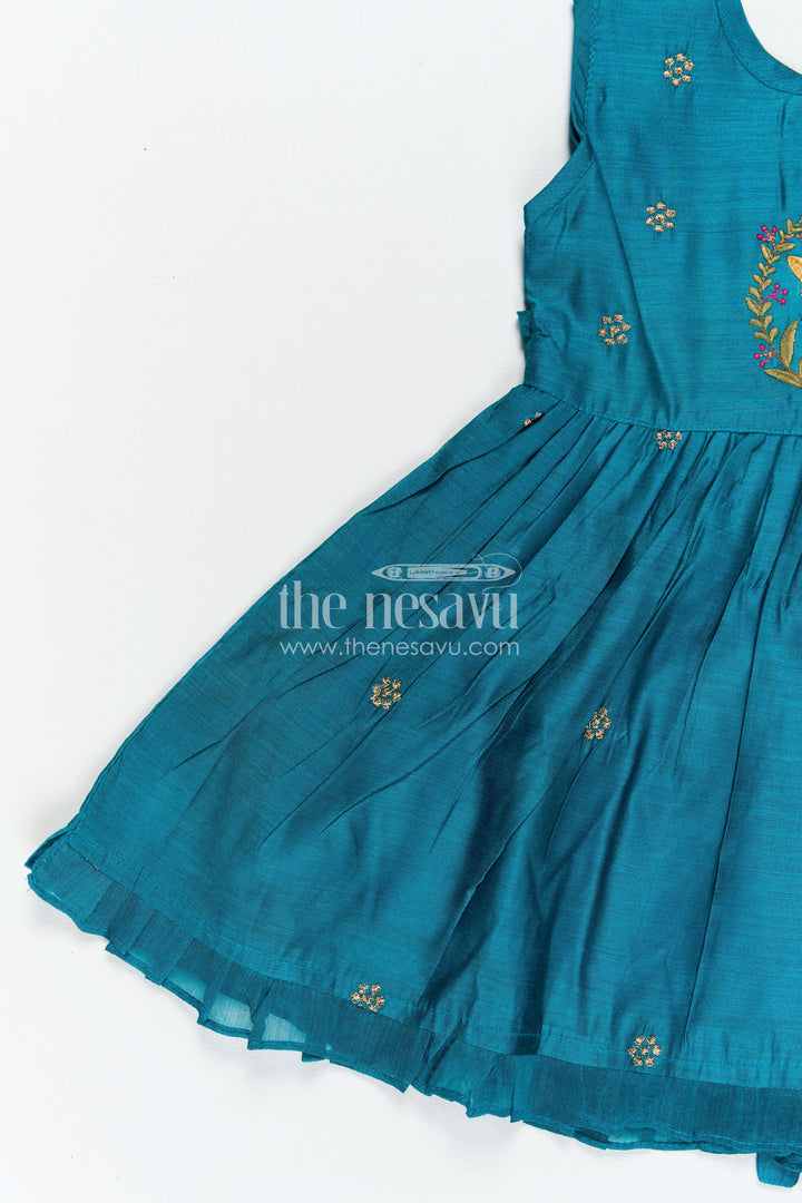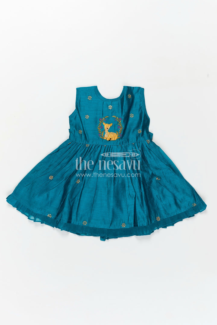 Simple yet stylish, this achha achha frock is perfect for everyday wear or small festive gatherings. Made from premium Chanderi fabric, it features subtle thread embroidery on the yoke and cute motif embellishments across the flared skirt. The rich teal hue offers a graceful touch, while the sleeveless design keeps it light and breathable. Embroidered with a deer motif at the center and finished with delicate pleats and a ruffle hem, this frock delivers both cuteness and comfort in equal measure.