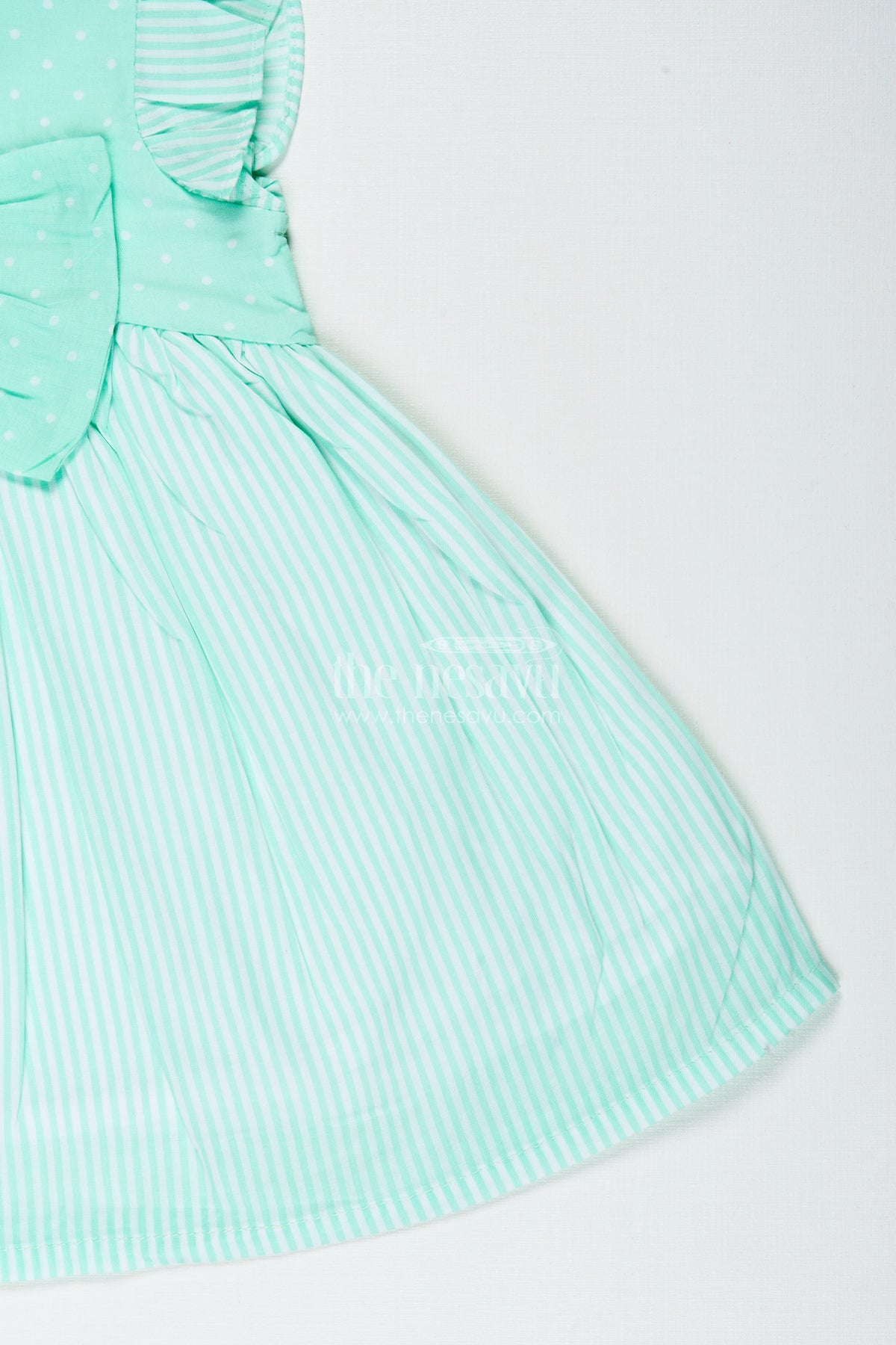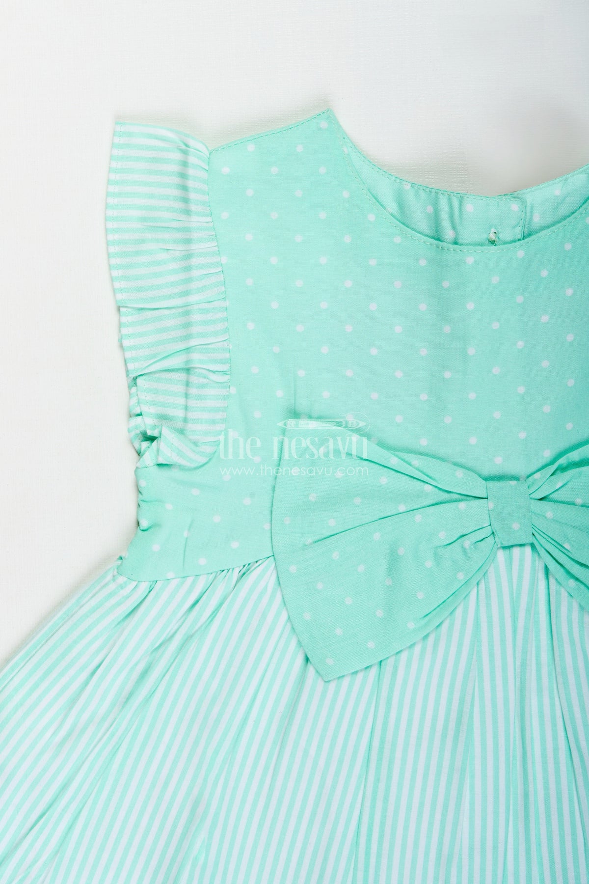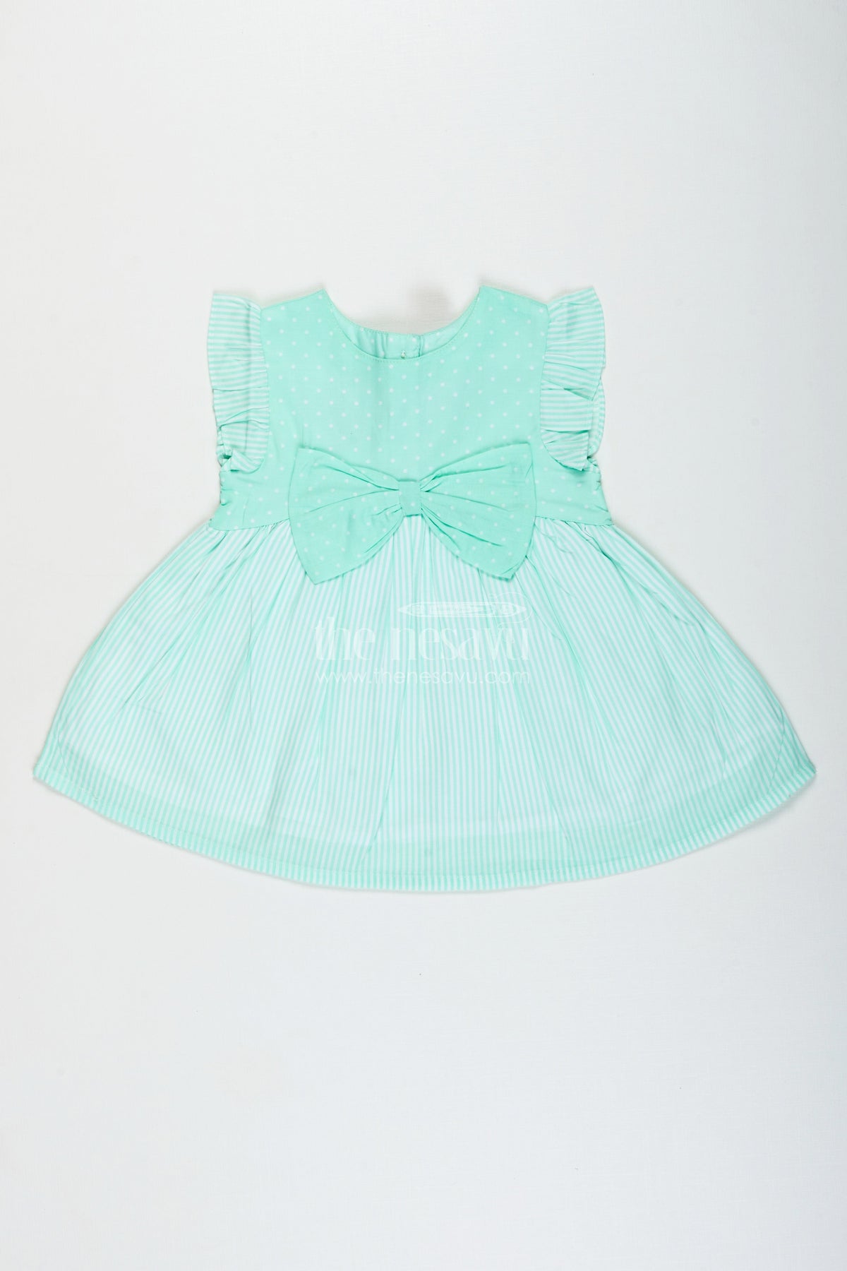 - Design: Dotted yoke, striped skirt, front bow