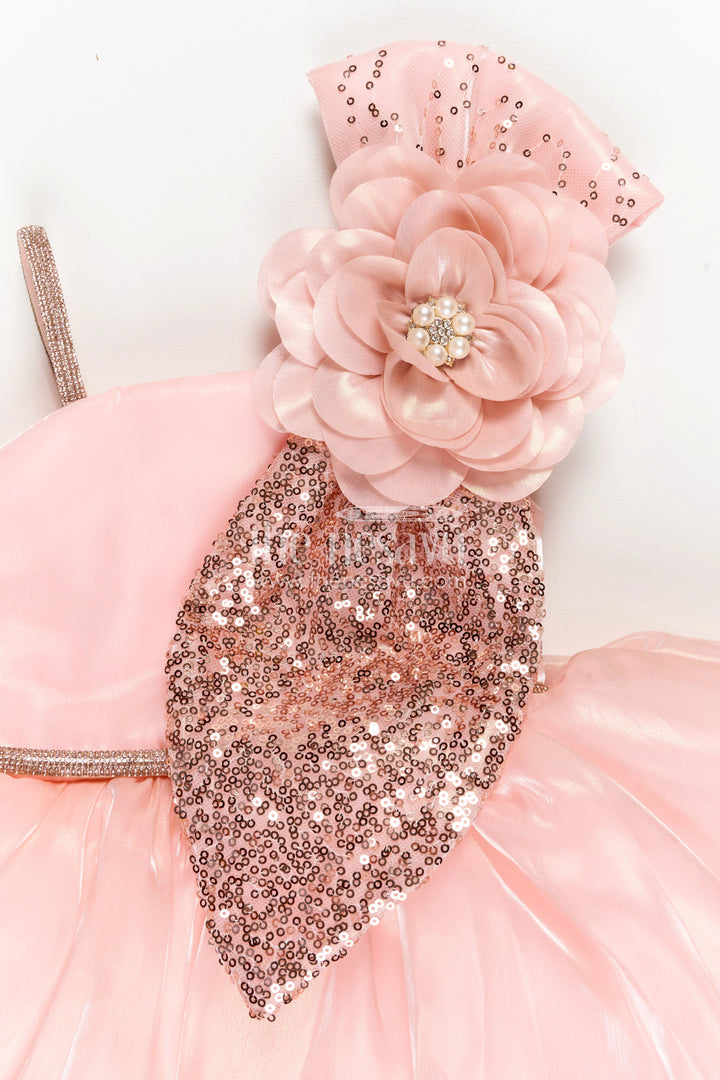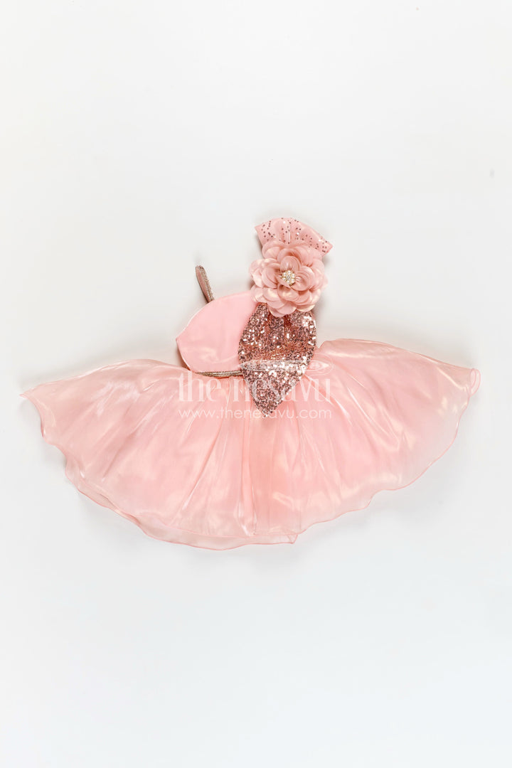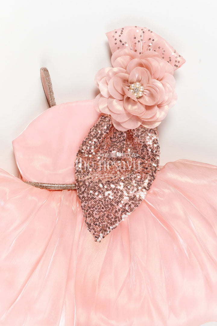 The latest frock model by Nesavu is a dreamy blend of shimmer, softness, and standout style. Designed in a lovely peach hue, this frock is crafted from light glaze organza fabric that feels feather-light on the skin. The bodice is adorned with eye-catching sequin embellishment, while a large 3D flower applique with a pearl center adds an extra dash of glamour. One shoulder strap and an asymmetrical neckline bring in a modern twist, while the layered skirt flares out beautifully for a fairy-tale look. This frock combines comfort with couture-inspired detailing, making it the perfect go-to outfit for your child’s dress-up days and unforgettable occasions.
