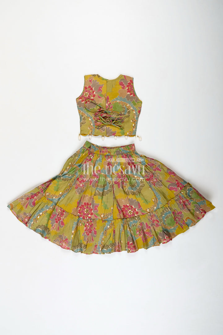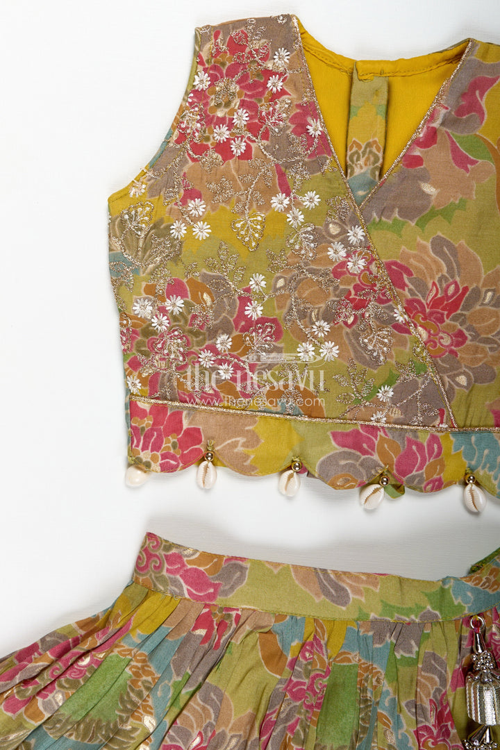 Lehenga choli in yellow colour makes a lively statement in this playful and stylish girls ethnic set. Crafted from breathable muslin silk, the outfit features a digitally printed floral lehenga with ruffled hem, paired with a sleeveless choli that boasts intricate thread embroidery and shell embellishments along the hemline. A bright yellow dupatta adds a pop of contrast and completes the festive ensemble. The wrap-style yoke is designed for a trendy fit while offering comfort and flexibility. Lightweight and full of colour, this set is ideal for birthdays, mehendis, and daytime functions.