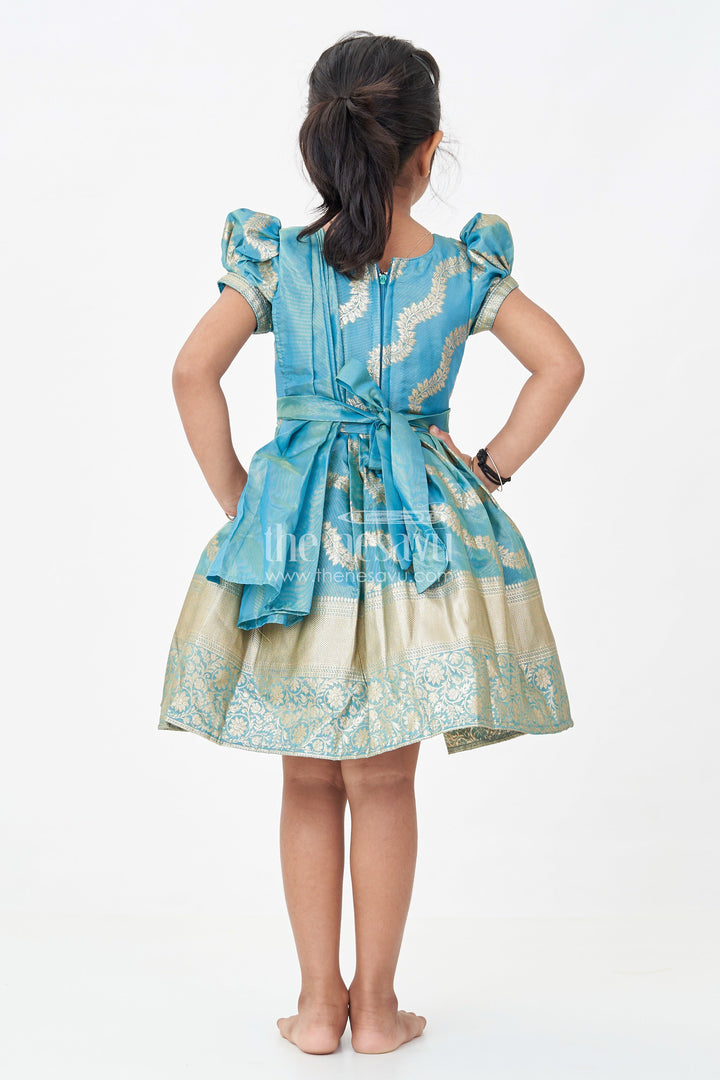 Girls Long Pattu Frocks in Blue Organza Silk Banarasi with Zari Big Border and Puff Sleeves