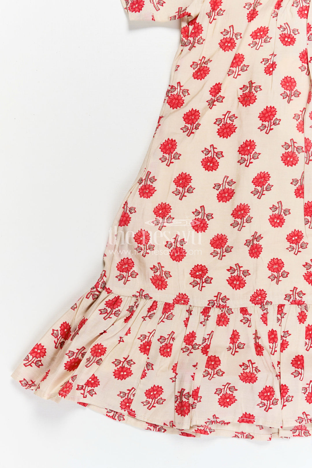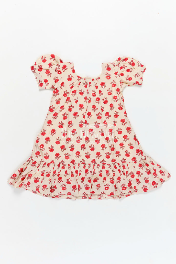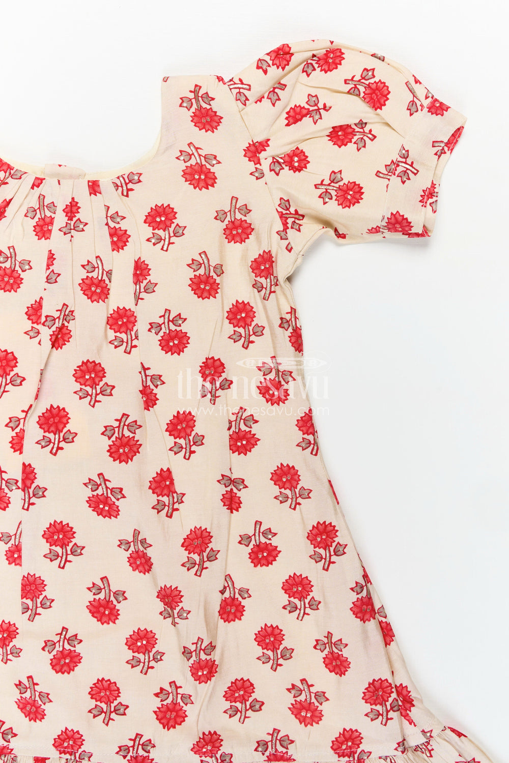 Girls Party Wear Knee Length Frock in Beige Muslin Silk with Red Floral Print and Puff Sleeves
