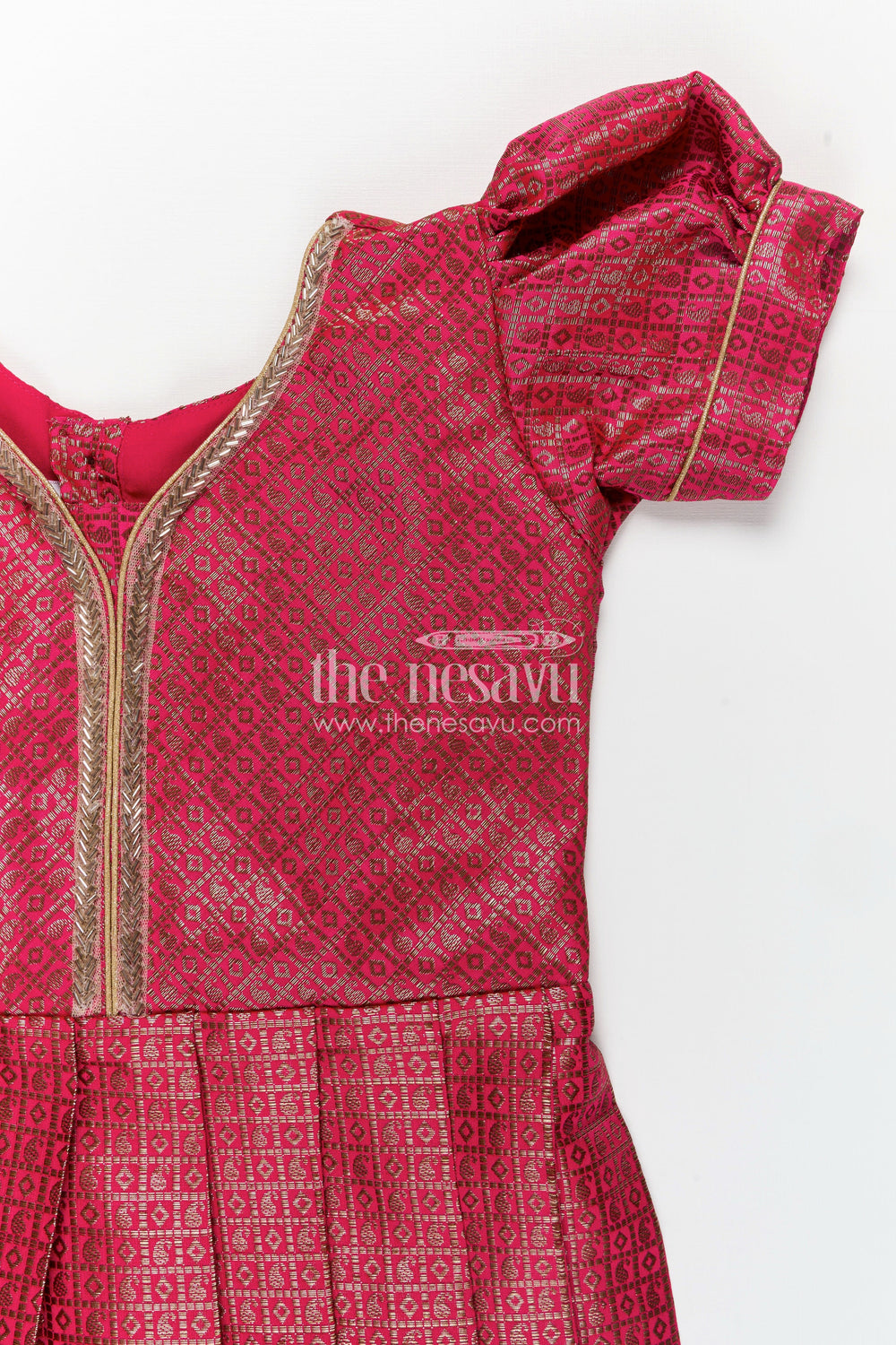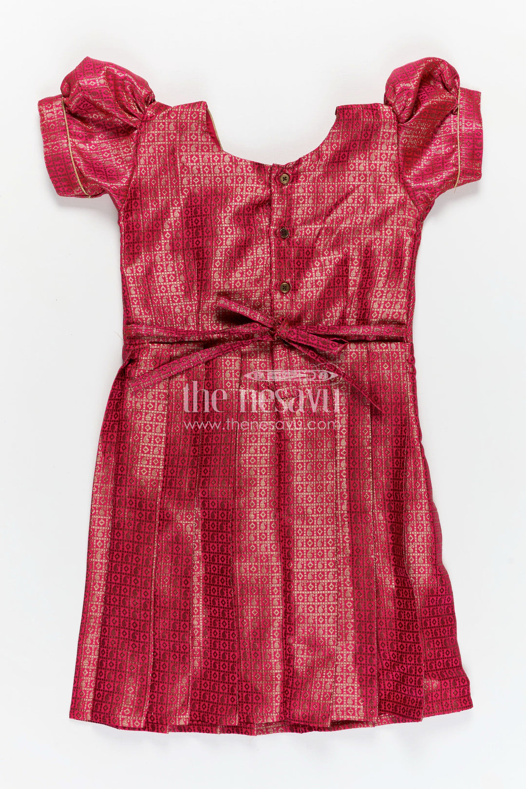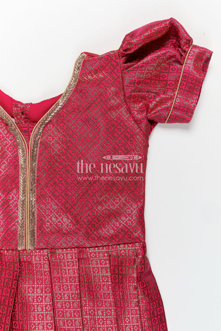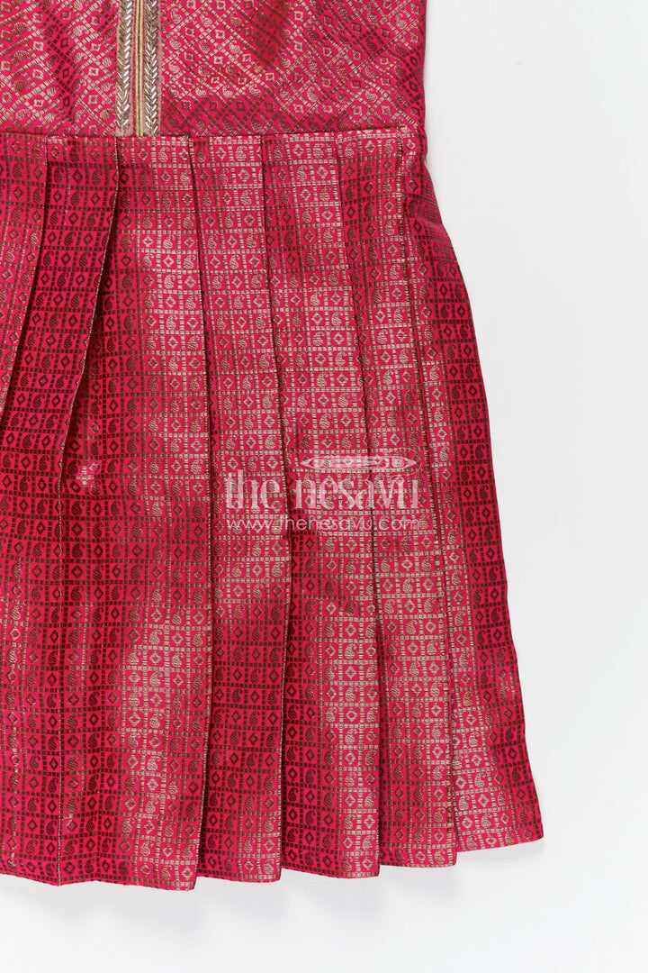 Silk dress design frock made from soft semi Banaras silk brings timeless charm to your child’s wardrobe. This radiant rose pink frock is adorned with golden woven motifs, creating an elegant brocade finish that exudes festivity. Designed with structured pleats for ease of movement and style, the frock’s puff sleeves and simple piping details along the neckline add refined accents. The back zip closure and breathable lining ensure it’s as comfortable as it is beautiful. Whether it's a temple visit or a cultural celebration, this dress strikes the perfect balance of elegance and practicality for young girls. Let your child shine in this beautifully crafted silk frock that celebrates Indian tradition with modern tailoring.