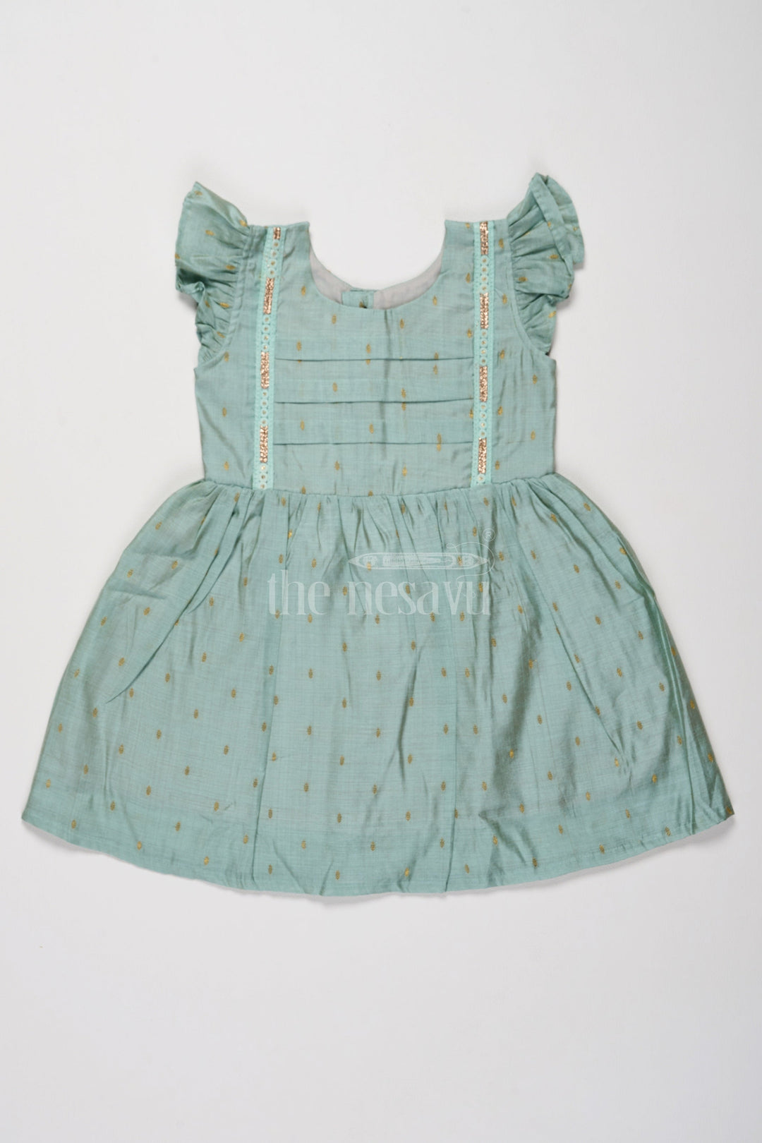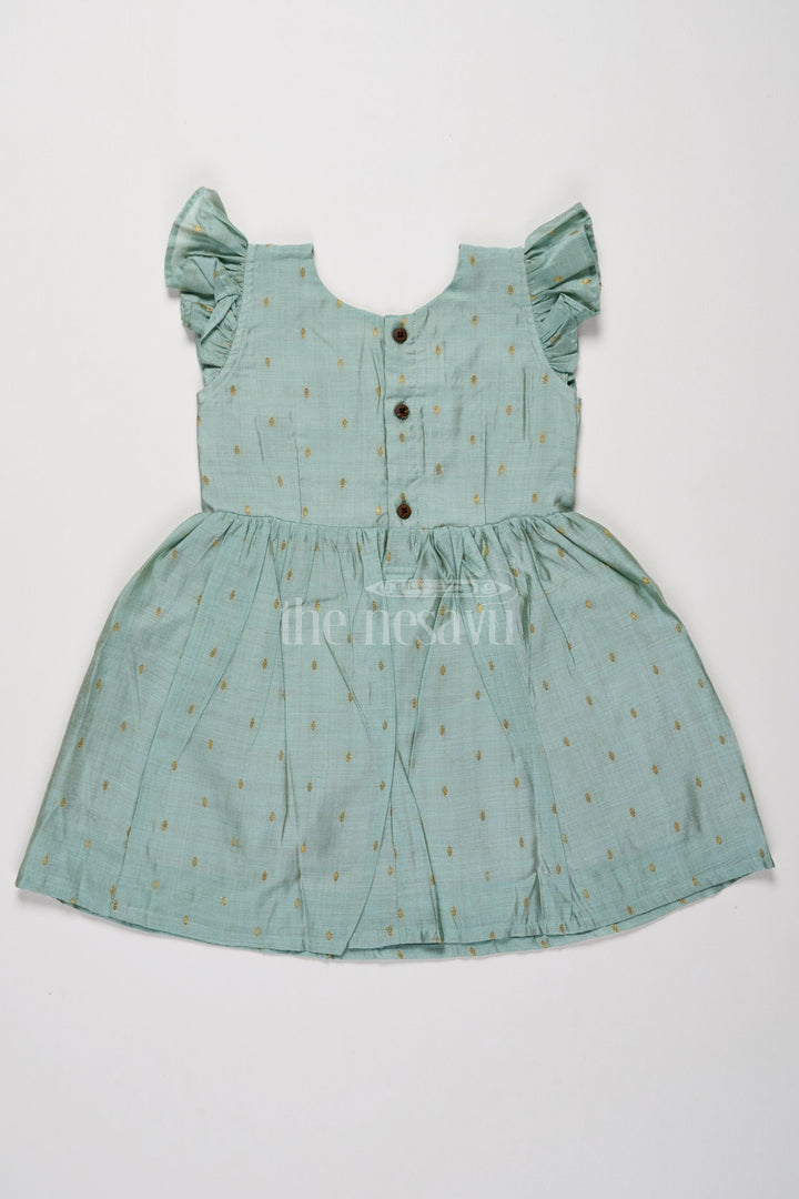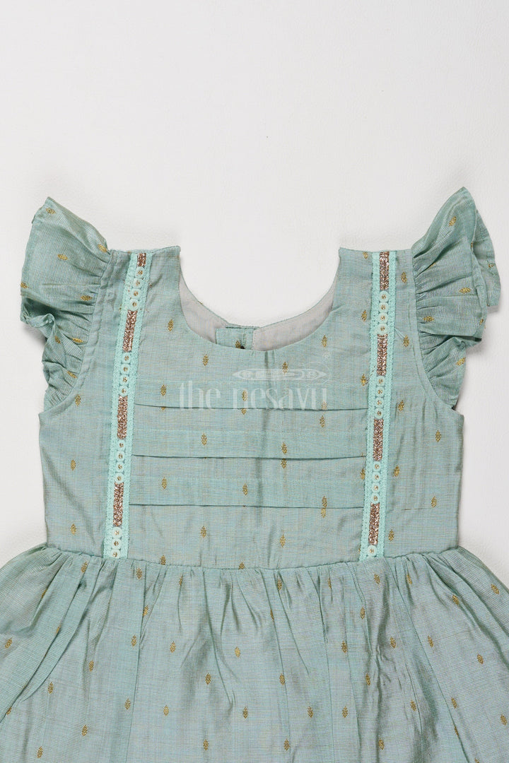Dress your child in timeless elegance with this cotton dress in a soft mint green hue. Made from premium Chanderi fabric, this dress features subtle golden threadwork motifs scattered across the pleated skirt, giving it a rich festive vibe. Adorned with flutter sleeves and fine lace detailing along the bodice, this frock is perfect for occasions like Diwali or wedding receptions. Its lightweight and airy design ensures unmatched comfort, making it suitable for all-day wear. A flawless combination of traditional aesthetics and modern comfort, this dress will quickly become a favorite in your child’s wardrobe.