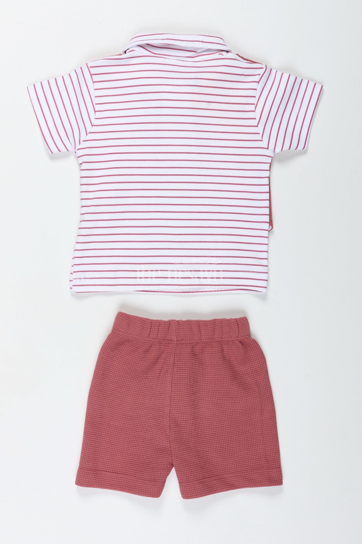 The peach dress casual set for boys combines elegance and comfort in a lightweight waffle knit cotton design. Featuring a peach-colored pair of shorts and a buttoned vest, this set is paired with a soft white and grey striped T-shirt to create a smart-casual look that works effortlessly for everyday wear. Designed for playful little gentlemen, the breathable waffle texture allows for extended comfort throughout the day, while the contrasting tones give this set a refined yet approachable vibe. Perfect for playdates, outings, or relaxed family gatherings, this outfit brings charm and versatility to your child's closet.