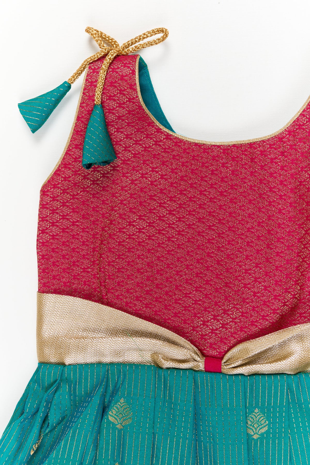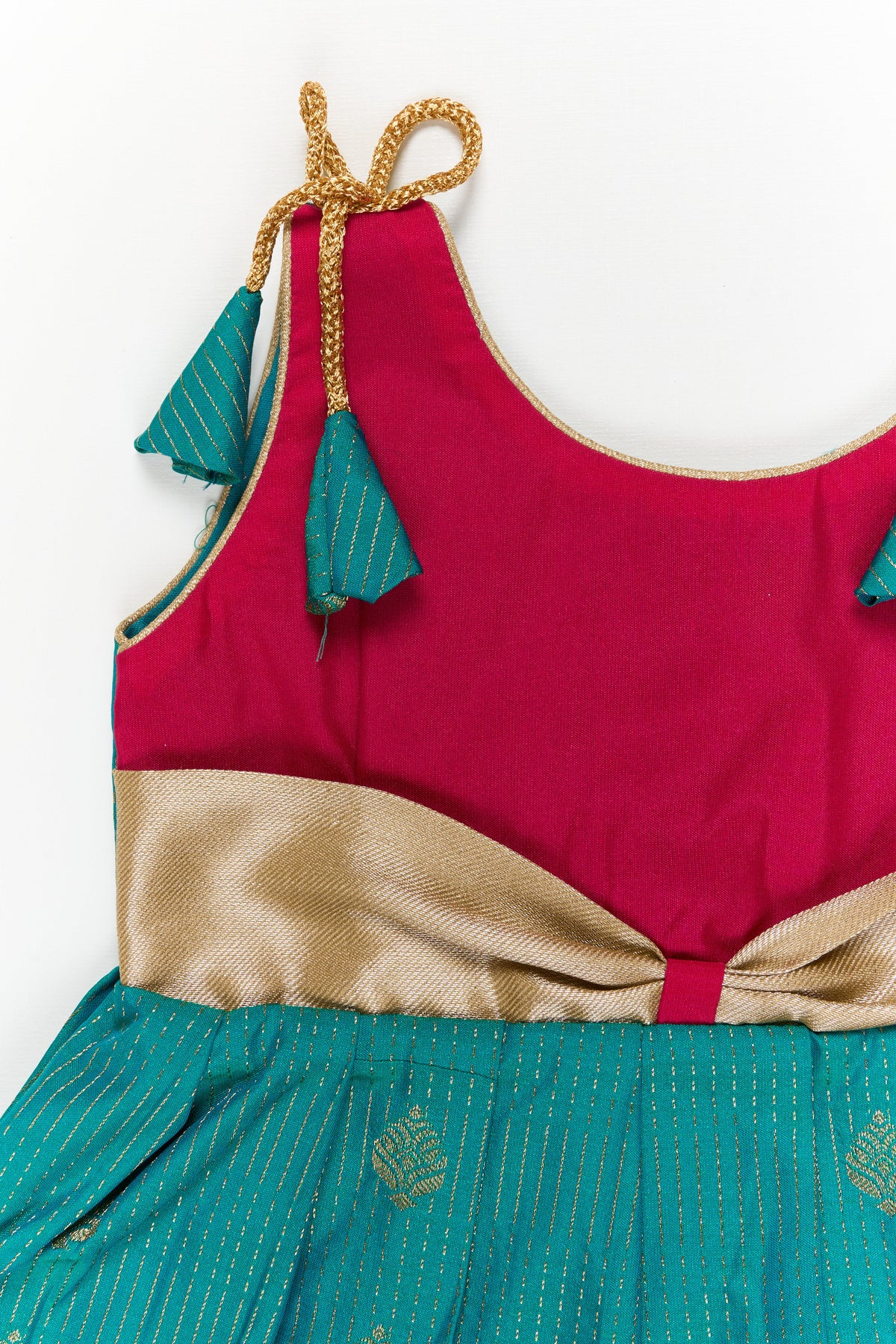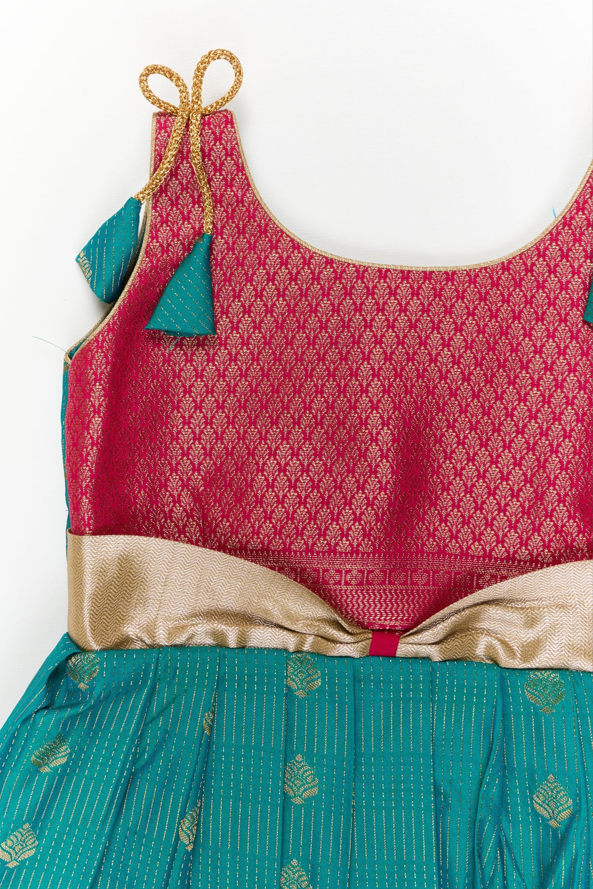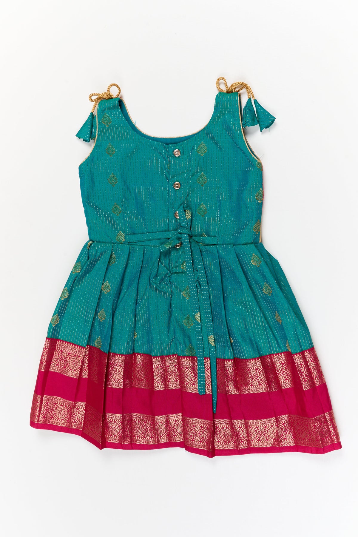The Nesavu Girls Kanchi Silk Frock Girls Kanchi Silk Frock for Wedding Functions and Festivals Nesavu 20 (3Y) / Green / Style 2 KSF022AB-20 Nesavu girls kanchi silk frock for weddings in semi designer bridal kanchivaram style