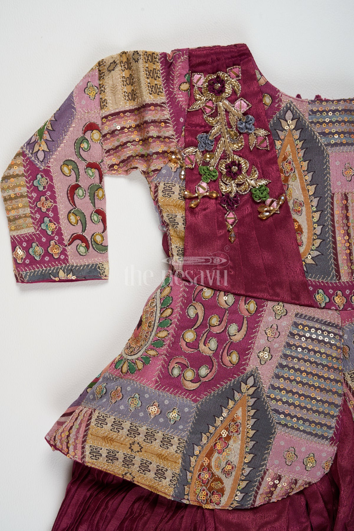 This elegant formal & gown diwali dress is designed for young girls who love to make a bold fashion statement during special celebrations like Diwali and family gatherings. The gown features a rich blended silk material, offering both comfort and a luxurious appearance. Its standout feature is the intricate patchwork embellishment on the bodice, which adds a touch of artisanal beauty and sophistication. The deep burgundy hue of the skirt, pleated to perfection, enhances the gown’s regal charm, while the unique asymmetrical design draws attention to its creative styling.The gown’s bodice showcases colorful, detailed embroidery with an ethnic patchwork style, adding a festive flair perfect for traditional events. The 3/4 sleeves and round neckline provide a balanced, modest look, making this gown ideal for family gatherings, photoshoots, and formal occasions. Designed for easy movement, the flowy, voluminous skirt gives it a twirl-worthy appeal, making it perfect for active young girls. This blended silk gown ensures that your child stays comfortable while looking her best throughout the celebrations.