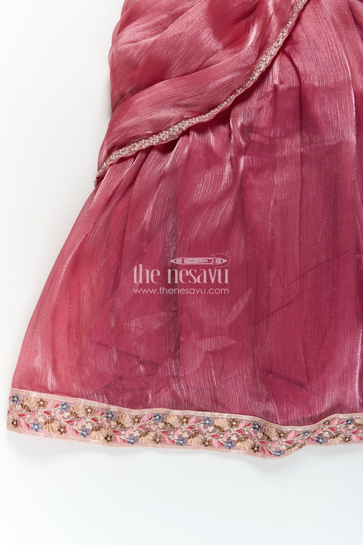 Gown dresses are the perfect statement for little fashionistas, and this rich wine-hued organza party gown adds a magical blend of elegance and sparkle. Crafted from fine organza fabric with a smooth, flowing finish, the gown features stone lace embellishments along the hem and dupatta, adding a delicate shimmer with every movement. The puff sleeves enhance its classic charm, while the soft pleats give it a flattering silhouette. Ideal for festive functions or formal events, this gown is lightweight and breathable—perfect for girls who love to look regal and feel comfortable all day long.