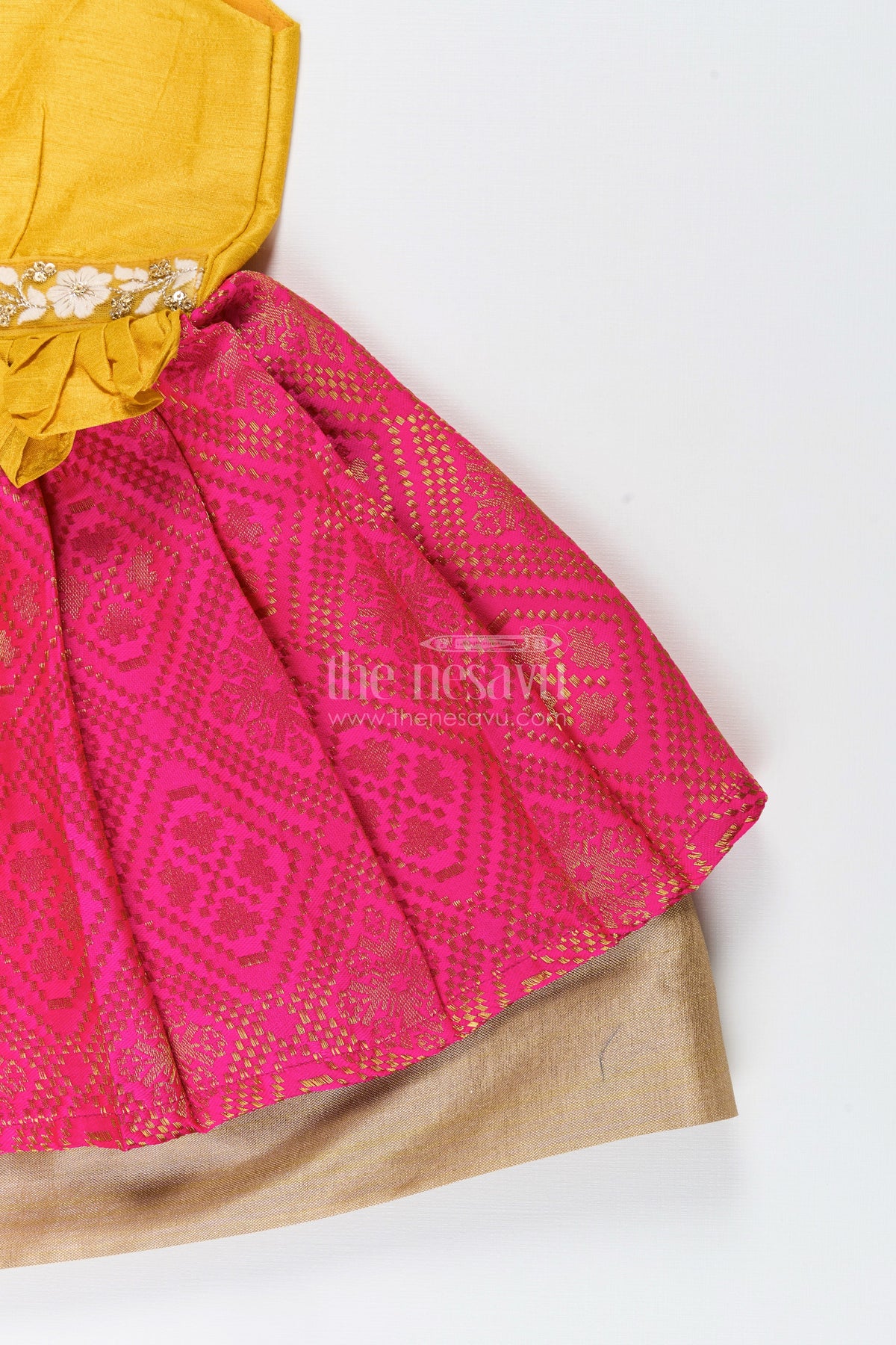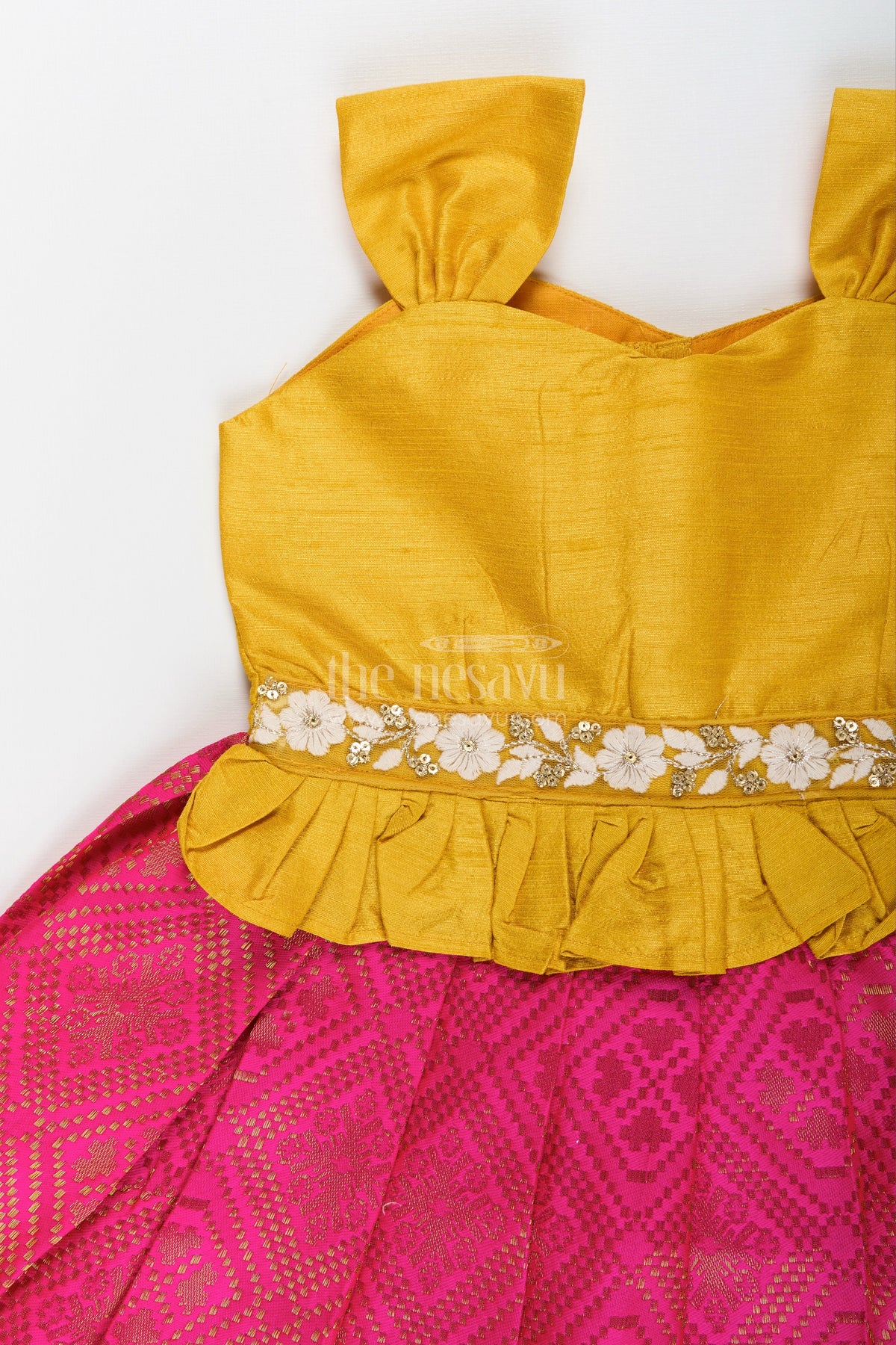 - Design: Contrast waistband, Pleated semi banaras hem, Tie-up shoulders