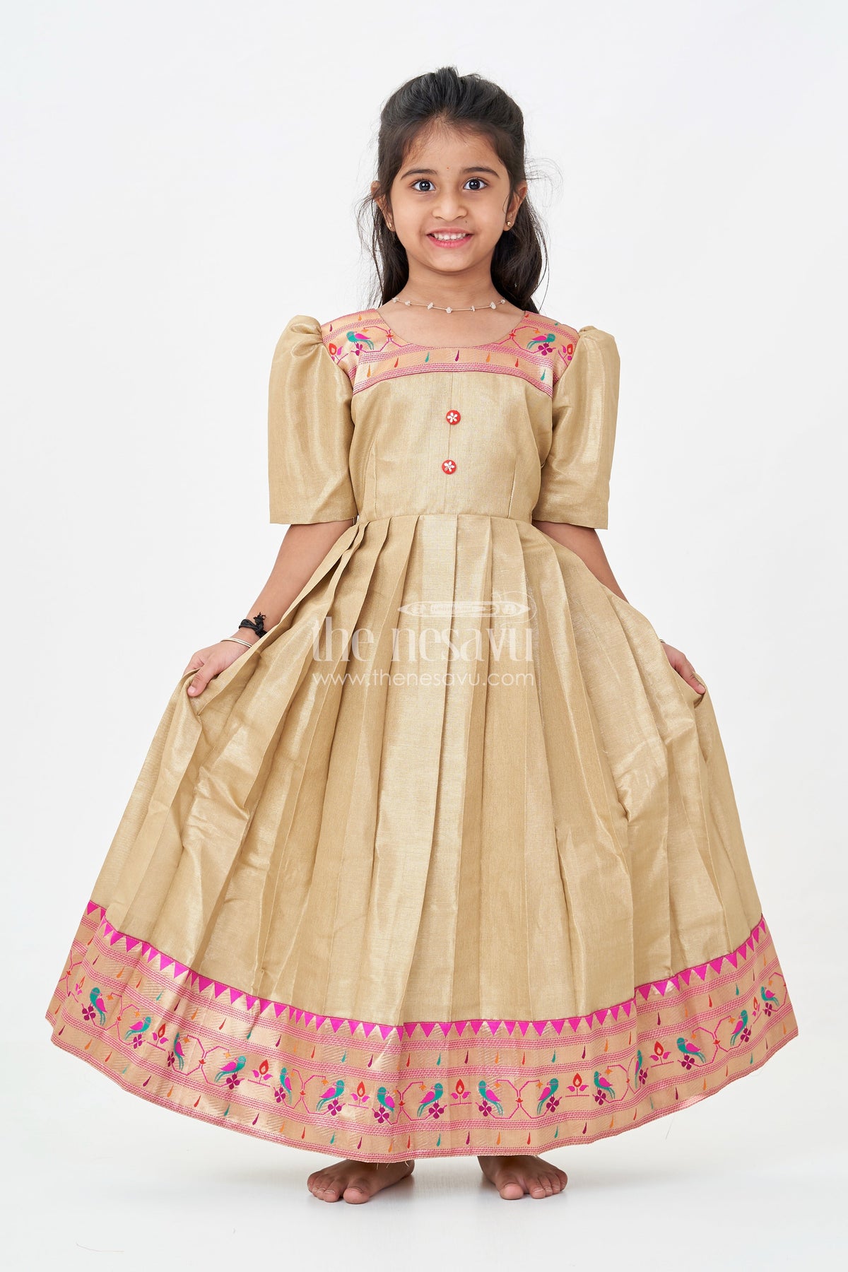 The Nesavu Girls Silk Gown Girls Anarkali Style Gown in Brown Tissue with Paithani Border and Structured Pleats Nesavu Girls Anarkali Style Gown Brown Tissue Silk Paithani Border Puff Sleeves | The Nesavu