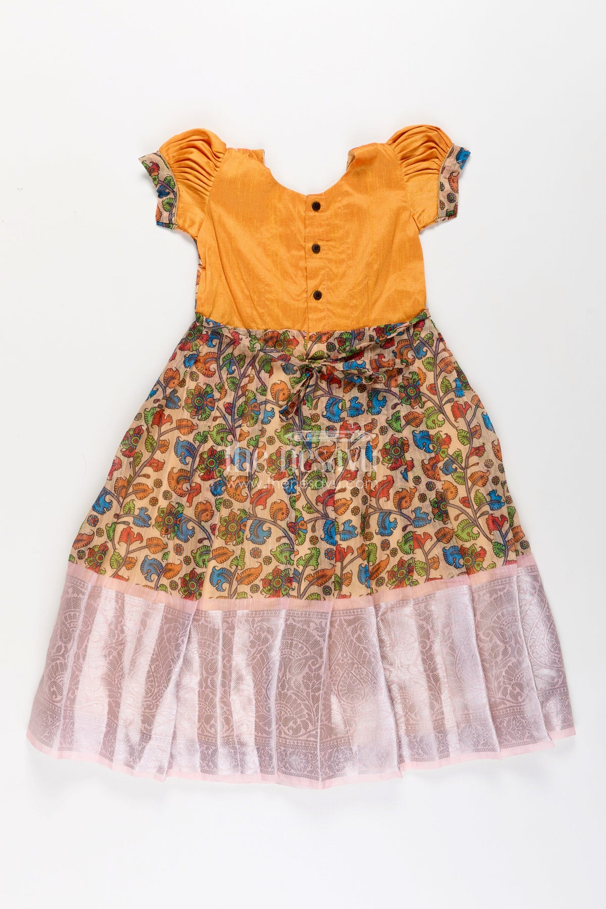 This yellow long gown is a playful yet graceful addition to any little girl’s ethnic wardrobe. Made from breathable chanderi cotton and styled with a vibrant raw silk embellished yoke in mustard yellow, this gown features a beautifully flared skirt with pastel pink borders and traditional patterns. The all-over floral print adds a splash of color and whimsy, while puff sleeves enhance its charming silhouette. Designed for comfort and tradition, this gown is ideal for festive events or family gatherings where style and freedom of movement go hand-in-hand.