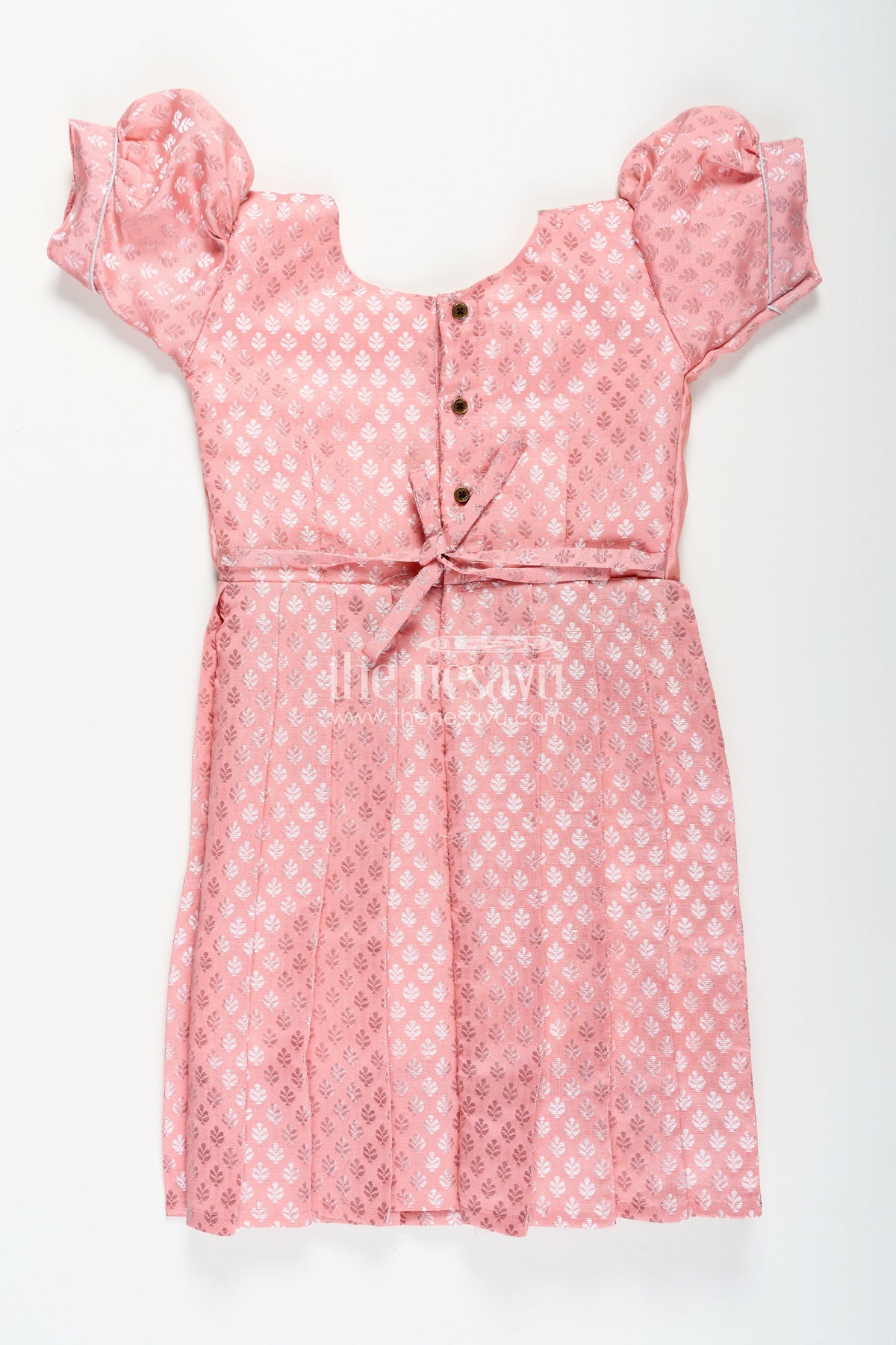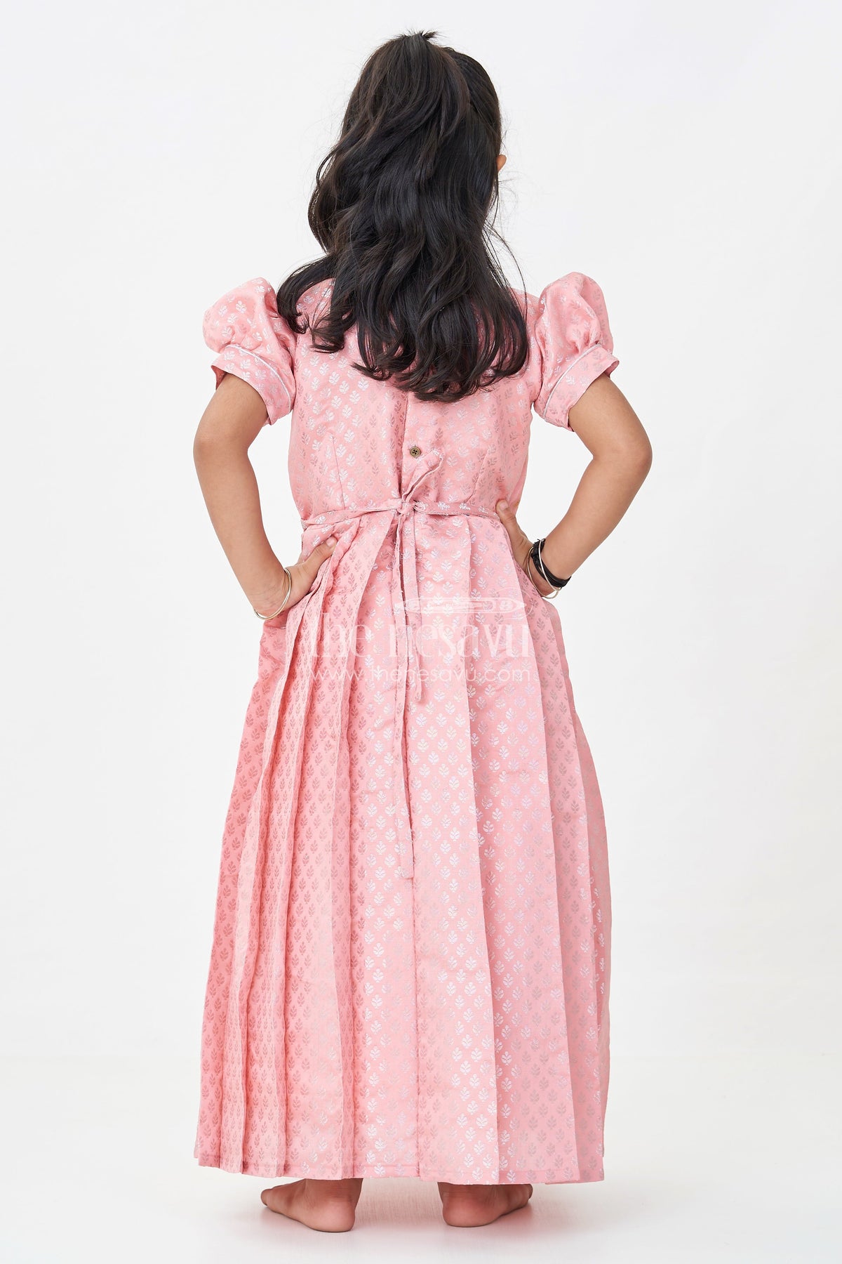 This pink party wear gown in semi banaras silk delivers a harmonious blend of rich texture and delicate design. Showcasing a muted peach-pink hue, the frock features intricately woven floral motifs all over, including the pleated skirt and bodice panel. Puff sleeves add a traditional silhouette, while the subtle shimmer from the banaras weave gives it a festive glow. Ideal for weddings, family functions, and cultural celebrations, this gown offers breathability, comfort, and an elevated ethnic charm. A wardrobe essential for young girls who love elegance with a touch of tradition.